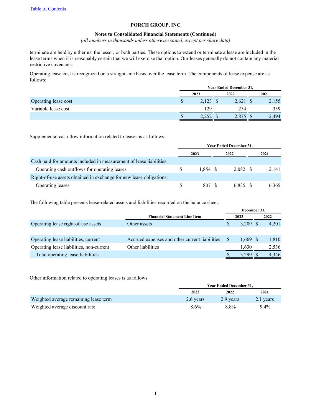 terminate are held by either us, the lessor, or both parties. These options to extend or terminate a lease are included in the lease terms when it is reasonably certain that we will exercise that option. Our leases generally do not contain any material restrictive covenants. Operating lease cost is recognized on a straight-line basis over the lease term. The components of lease expense are as follows: Year Ended December 31, 2023 2022 2021 Operating lease cost $ 2,123 $ 2,621 $ 2,155 Variable lease cost 129 254 339 $ 2,252 $ 2,875 $ 2,494 Supplemental cash flow information related to leases is as follows: Year Ended December 31, 2023 2022 2021 Cash paid for amounts included in measurement of lease liabilities: Operating cash outflows for operating leases $ 1,854 $ 2,082 $ 2,141 Right-of-use assets obtained in exchange for new lease obligations: Operating leases $ 807 $ 6,835 $ 6,365 The following table presents lease-related assets and liabilities recorded on the balance sheet. December 31, Financial Statement Line Item 2023 2022 Operating lease right-of-use assets Other assets $ 3,209 $ 4,201 Operating lease liabilities, current Accrued expenses and other current liabilities $ 1,669 $ 1,810 Operating lease liabilities, non-current Other liabilities 1,630 2,536 Total operating lease liabilities $ 3,299 $ 4,346 Other information related to operating leases is as follows: Year Ended December 31, 2023 2022 2021 Weighted average remaining lease term 2.6 years 2.9 years 2.1 years Weighted average discount rate 8.6% 8.8% 9.4% Table of Contents PORCH GROUP, INC Notes to Consolidated Financial Statements (Continued) (all numbers in thousands unless otherwise stated, except per share data) 111