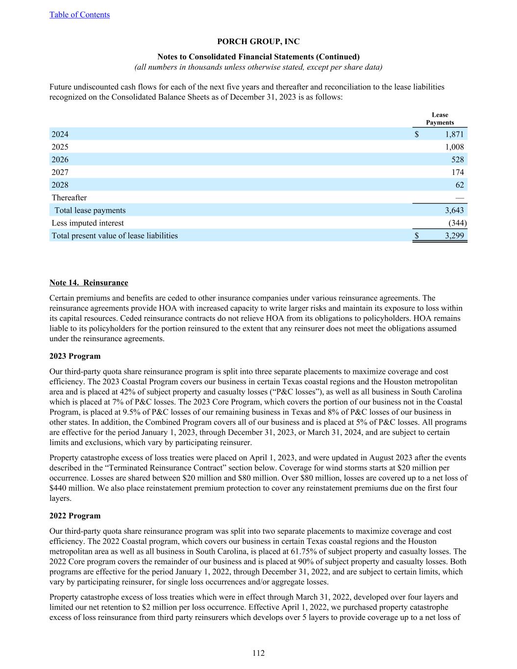 Future undiscounted cash flows for each of the next five years and thereafter and reconciliation to the lease liabilities recognized on the Consolidated Balance Sheets as of December 31, 2023 is as follows: Lease Payments 2024 $ 1,871 2025 1,008 2026 528 2027 174 2028 62 Thereafter — Total lease payments 3,643 Less imputed interest (344) Total present value of lease liabilities $ 3,299 Note 14. Reinsurance Certain premiums and benefits are ceded to other insurance companies under various reinsurance agreements. The reinsurance agreements provide HOA with increased capacity to write larger risks and maintain its exposure to loss within its capital resources. Ceded reinsurance contracts do not relieve HOA from its obligations to policyholders. HOA remains liable to its policyholders for the portion reinsured to the extent that any reinsurer does not meet the obligations assumed under the reinsurance agreements. 2023 Program Our third-party quota share reinsurance program is split into three separate placements to maximize coverage and cost efficiency. The 2023 Coastal Program covers our business in certain Texas coastal regions and the Houston metropolitan area and is placed at 42% of subject property and casualty losses (“P&C losses”), as well as all business in South Carolina which is placed at 7% of P&C losses. The 2023 Core Program, which covers the portion of our business not in the Coastal Program, is placed at 9.5% of P&C losses of our remaining business in Texas and 8% of P&C losses of our business in other states. In addition, the Combined Program covers all of our business and is placed at 5% of P&C losses. All programs are effective for the period January 1, 2023, through December 31, 2023, or March 31, 2024, and are subject to certain limits and exclusions, which vary by participating reinsurer. Property catastrophe excess of loss treaties were placed on April 1, 2023, and were updated in August 2023 after the events described in the “Terminated Reinsurance Contract” section below. Coverage for wind storms starts at $20 million per occurrence. Losses are shared between $20 million and $80 million. Over $80 million, losses are covered up to a net loss of $440 million. We also place reinstatement premium protection to cover any reinstatement premiums due on the first four layers. 2022 Program Our third-party quota share reinsurance program was split into two separate placements to maximize coverage and cost efficiency. The 2022 Coastal program, which covers our business in certain Texas coastal regions and the Houston metropolitan area as well as all business in South Carolina, is placed at 61.75% of subject property and casualty losses. The 2022 Core program covers the remainder of our business and is placed at 90% of subject property and casualty losses. Both programs are effective for the period January 1, 2022, through December 31, 2022, and are subject to certain limits, which vary by participating reinsurer, for single loss occurrences and/or aggregate losses. Property catastrophe excess of loss treaties which were in effect through March 31, 2022, developed over four layers and limited our net retention to $2 million per loss occurrence. Effective April 1, 2022, we purchased property catastrophe excess of loss reinsurance from third party reinsurers which develops over 5 layers to provide coverage up to a net loss of Table of Contents PORCH GROUP, INC Notes to Consolidated Financial Statements (Continued) (all numbers in thousands unless otherwise stated, except per share data) 112