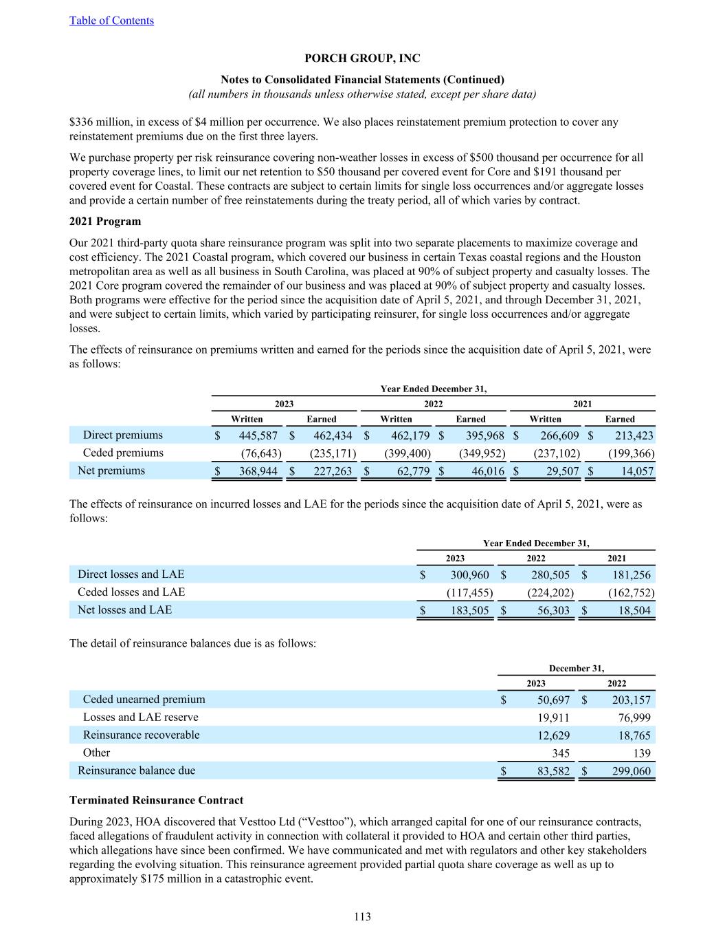 $336 million, in excess of $4 million per occurrence. We also places reinstatement premium protection to cover any reinstatement premiums due on the first three layers. We purchase property per risk reinsurance covering non-weather losses in excess of $500 thousand per occurrence for all property coverage lines, to limit our net retention to $50 thousand per covered event for Core and $191 thousand per covered event for Coastal. These contracts are subject to certain limits for single loss occurrences and/or aggregate losses and provide a certain number of free reinstatements during the treaty period, all of which varies by contract. 2021 Program Our 2021 third-party quota share reinsurance program was split into two separate placements to maximize coverage and cost efficiency. The 2021 Coastal program, which covered our business in certain Texas coastal regions and the Houston metropolitan area as well as all business in South Carolina, was placed at 90% of subject property and casualty losses. The 2021 Core program covered the remainder of our business and was placed at 90% of subject property and casualty losses. Both programs were effective for the period since the acquisition date of April 5, 2021, and through December 31, 2021, and were subject to certain limits, which varied by participating reinsurer, for single loss occurrences and/or aggregate losses. The effects of reinsurance on premiums written and earned for the periods since the acquisition date of April 5, 2021, were as follows: Year Ended December 31, 2023 2022 2021 Written Earned Written Earned Written Earned Direct premiums $ 445,587 $ 462,434 $ 462,179 $ 395,968 $ 266,609 $ 213,423 Ceded premiums (76,643) (235,171) (399,400) (349,952) (237,102) (199,366) Net premiums $ 368,944 $ 227,263 $ 62,779 $ 46,016 $ 29,507 $ 14,057 The effects of reinsurance on incurred losses and LAE for the periods since the acquisition date of April 5, 2021, were as follows: Year Ended December 31, 2023 2022 2021 Direct losses and LAE $ 300,960 $ 280,505 $ 181,256 Ceded losses and LAE (117,455) (224,202) (162,752) Net losses and LAE $ 183,505 $ 56,303 $ 18,504 The detail of reinsurance balances due is as follows: December 31, 2023 2022 Ceded unearned premium $ 50,697 $ 203,157 Losses and LAE reserve 19,911 76,999 Reinsurance recoverable 12,629 18,765 Other 345 139 Reinsurance balance due $ 83,582 $ 299,060 Terminated Reinsurance Contract During 2023, HOA discovered that Vesttoo Ltd (“Vesttoo”), which arranged capital for one of our reinsurance contracts, faced allegations of fraudulent activity in connection with collateral it provided to HOA and certain other third parties, which allegations have since been confirmed. We have communicated and met with regulators and other key stakeholders regarding the evolving situation. This reinsurance agreement provided partial quota share coverage as well as up to approximately $175 million in a catastrophic event. Table of Contents PORCH GROUP, INC Notes to Consolidated Financial Statements (Continued) (all numbers in thousands unless otherwise stated, except per share data) 113
