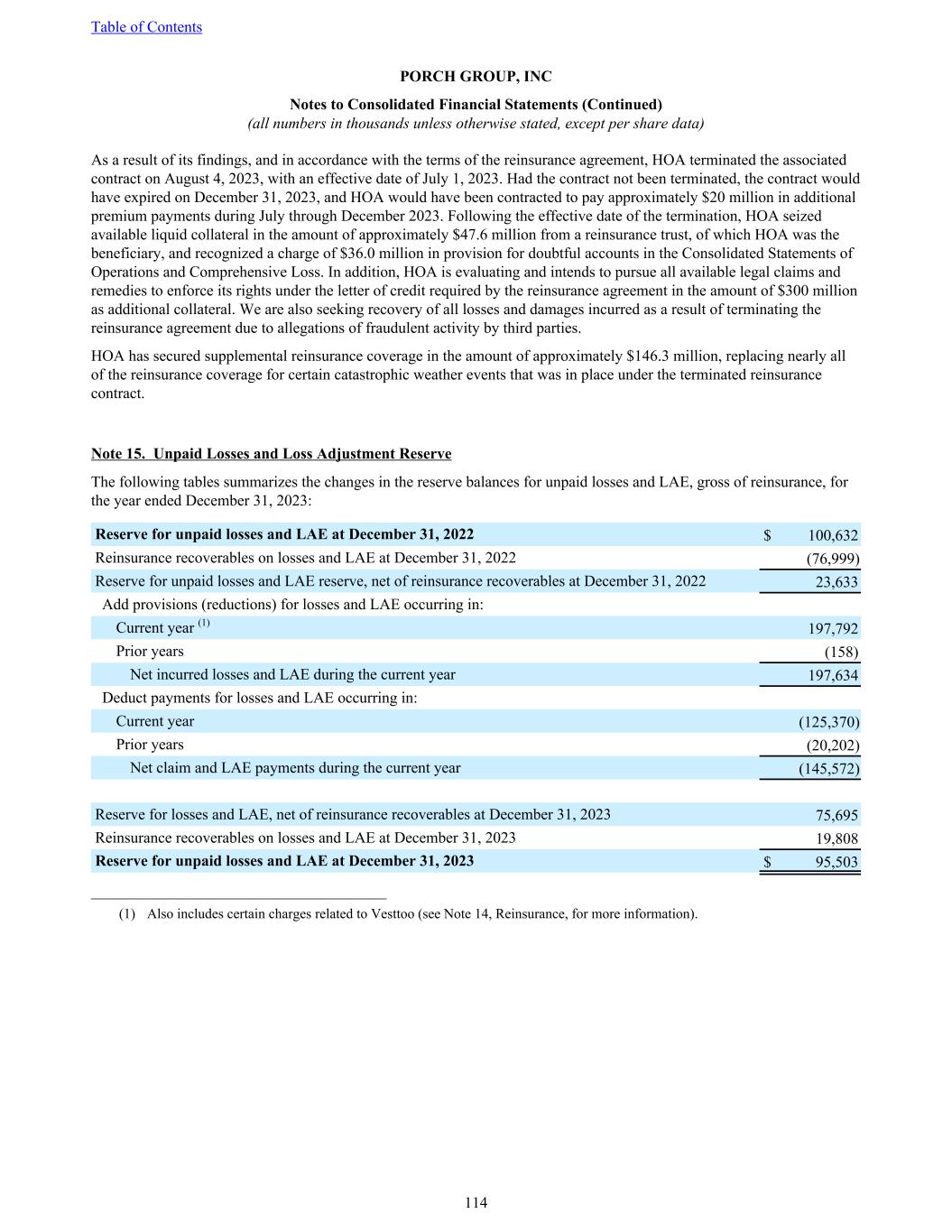 As a result of its findings, and in accordance with the terms of the reinsurance agreement, HOA terminated the associated contract on August 4, 2023, with an effective date of July 1, 2023. Had the contract not been terminated, the contract would have expired on December 31, 2023, and HOA would have been contracted to pay approximately $20 million in additional premium payments during July through December 2023. Following the effective date of the termination, HOA seized available liquid collateral in the amount of approximately $47.6 million from a reinsurance trust, of which HOA was the beneficiary, and recognized a charge of $36.0 million in provision for doubtful accounts in the Consolidated Statements of Operations and Comprehensive Loss. In addition, HOA is evaluating and intends to pursue all available legal claims and remedies to enforce its rights under the letter of credit required by the reinsurance agreement in the amount of $300 million as additional collateral. We are also seeking recovery of all losses and damages incurred as a result of terminating the reinsurance agreement due to allegations of fraudulent activity by third parties. HOA has secured supplemental reinsurance coverage in the amount of approximately $146.3 million, replacing nearly all of the reinsurance coverage for certain catastrophic weather events that was in place under the terminated reinsurance contract. Note 15. Unpaid Losses and Loss Adjustment Reserve The following tables summarizes the changes in the reserve balances for unpaid losses and LAE, gross of reinsurance, for the year ended December 31, 2023: Reserve for unpaid losses and LAE at December 31, 2022 $ 100,632 Reinsurance recoverables on losses and LAE at December 31, 2022 (76,999) Reserve for unpaid losses and LAE reserve, net of reinsurance recoverables at December 31, 2022 23,633 Add provisions (reductions) for losses and LAE occurring in: Current year (1) 197,792 Prior years (158) Net incurred losses and LAE during the current year 197,634 Deduct payments for losses and LAE occurring in: Current year (125,370) Prior years (20,202) Net claim and LAE payments during the current year (145,572) Reserve for losses and LAE, net of reinsurance recoverables at December 31, 2023 75,695 Reinsurance recoverables on losses and LAE at December 31, 2023 19,808 Reserve for unpaid losses and LAE at December 31, 2023 $ 95,503 ______________________________________ (1) Also includes certain charges related to Vesttoo (see Note 14, Reinsurance, for more information). Table of Contents PORCH GROUP, INC Notes to Consolidated Financial Statements (Continued) (all numbers in thousands unless otherwise stated, except per share data) 114