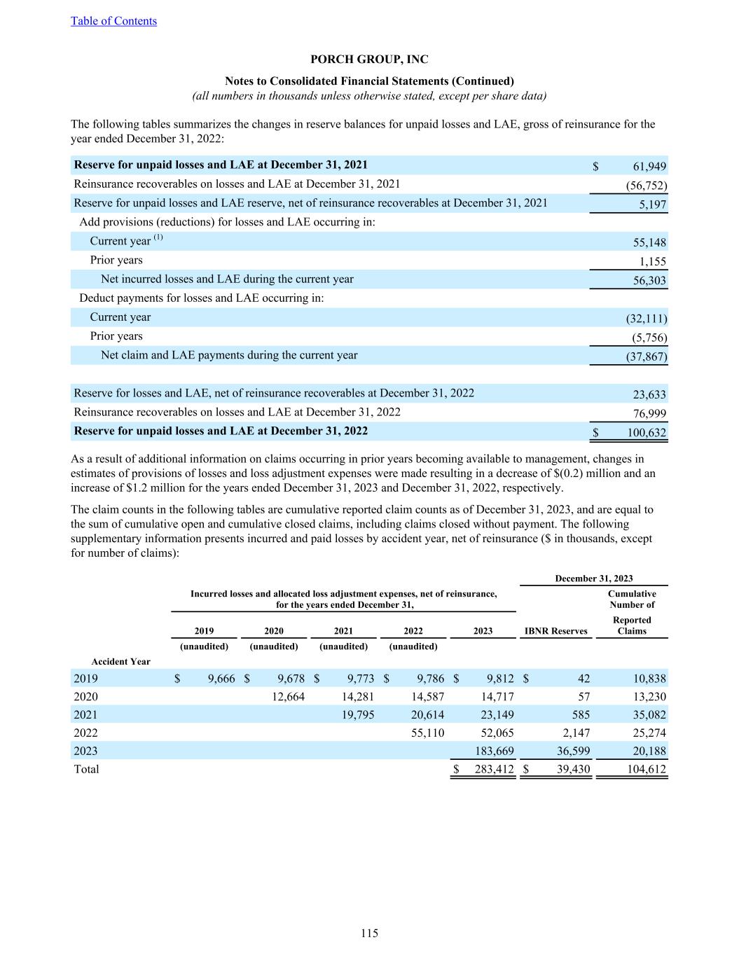 The following tables summarizes the changes in reserve balances for unpaid losses and LAE, gross of reinsurance for the year ended December 31, 2022: Reserve for unpaid losses and LAE at December 31, 2021 $ 61,949 Reinsurance recoverables on losses and LAE at December 31, 2021 (56,752) Reserve for unpaid losses and LAE reserve, net of reinsurance recoverables at December 31, 2021 5,197 Add provisions (reductions) for losses and LAE occurring in: Current year (1) 55,148 Prior years 1,155 Net incurred losses and LAE during the current year 56,303 Deduct payments for losses and LAE occurring in: Current year (32,111) Prior years (5,756) Net claim and LAE payments during the current year (37,867) Reserve for losses and LAE, net of reinsurance recoverables at December 31, 2022 23,633 Reinsurance recoverables on losses and LAE at December 31, 2022 76,999 Reserve for unpaid losses and LAE at December 31, 2022 $ 100,632 As a result of additional information on claims occurring in prior years becoming available to management, changes in estimates of provisions of losses and loss adjustment expenses were made resulting in a decrease of $(0.2) million and an increase of $1.2 million for the years ended December 31, 2023 and December 31, 2022, respectively. The claim counts in the following tables are cumulative reported claim counts as of December 31, 2023, and are equal to the sum of cumulative open and cumulative closed claims, including claims closed without payment. The following supplementary information presents incurred and paid losses by accident year, net of reinsurance ($ in thousands, except for number of claims): December 31, 2023 Incurred losses and allocated loss adjustment expenses, net of reinsurance, for the years ended December 31, Cumulative Number of 2019 2020 2021 2022 2023 IBNR Reserves Reported Claims (unaudited) (unaudited) (unaudited) (unaudited) Accident Year 2019 $ 9,666 $ 9,678 $ 9,773 $ 9,786 $ 9,812 $ 42 10,838 2020 12,664 14,281 14,587 14,717 57 13,230 2021 19,795 20,614 23,149 585 35,082 2022 55,110 52,065 2,147 25,274 2023 183,669 36,599 20,188 Total $ 283,412 $ 39,430 104,612 Table of Contents PORCH GROUP, INC Notes to Consolidated Financial Statements (Continued) (all numbers in thousands unless otherwise stated, except per share data) 115