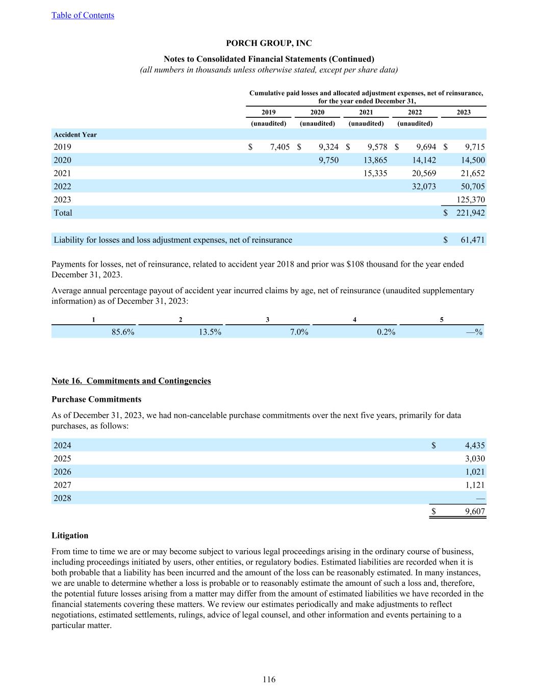 Cumulative paid losses and allocated adjustment expenses, net of reinsurance, for the year ended December 31, 2019 2020 2021 2022 2023 (unaudited) (unaudited) (unaudited) (unaudited) Accident Year 2019 $ 7,405 $ 9,324 $ 9,578 $ 9,694 $ 9,715 2020 9,750 13,865 14,142 14,500 2021 15,335 20,569 21,652 2022 32,073 50,705 2023 125,370 Total $ 221,942 Liability for losses and loss adjustment expenses, net of reinsurance $ 61,471 Payments for losses, net of reinsurance, related to accident year 2018 and prior was $108 thousand for the year ended December 31, 2023. Average annual percentage payout of accident year incurred claims by age, net of reinsurance (unaudited supplementary information) as of December 31, 2023: 1 2 3 4 5 85.6 % 13.5 % 7.0 % 0.2 % — % Note 16. Commitments and Contingencies Purchase Commitments As of December 31, 2023, we had non-cancelable purchase commitments over the next five years, primarily for data purchases, as follows: 2024 $ 4,435 2025 3,030 2026 1,021 2027 1,121 2028 — $ 9,607 Litigation From time to time we are or may become subject to various legal proceedings arising in the ordinary course of business, including proceedings initiated by users, other entities, or regulatory bodies. Estimated liabilities are recorded when it is both probable that a liability has been incurred and the amount of the loss can be reasonably estimated. In many instances, we are unable to determine whether a loss is probable or to reasonably estimate the amount of such a loss and, therefore, the potential future losses arising from a matter may differ from the amount of estimated liabilities we have recorded in the financial statements covering these matters. We review our estimates periodically and make adjustments to reflect negotiations, estimated settlements, rulings, advice of legal counsel, and other information and events pertaining to a particular matter. Table of Contents PORCH GROUP, INC Notes to Consolidated Financial Statements (Continued) (all numbers in thousands unless otherwise stated, except per share data) 116