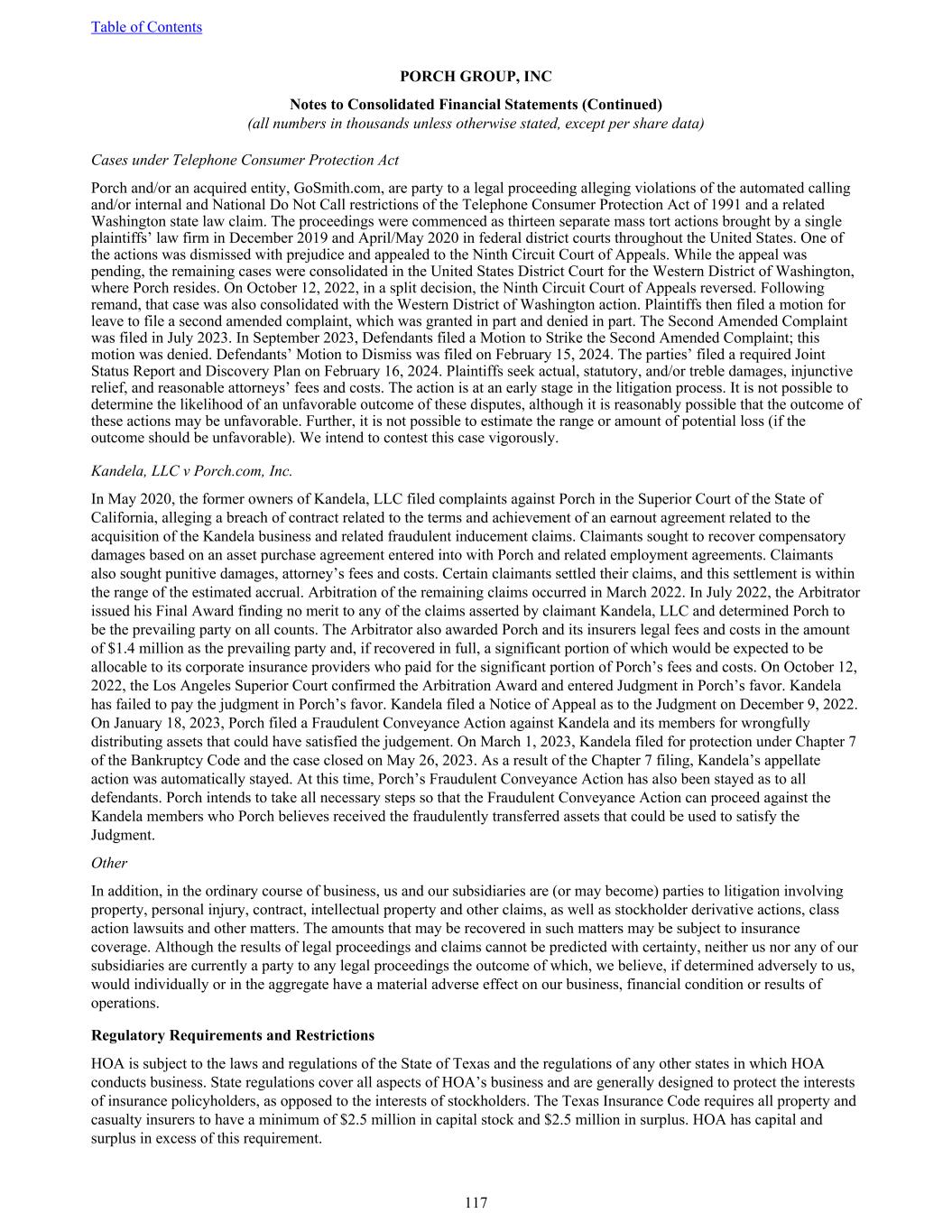 Cases under Telephone Consumer Protection Act Porch and/or an acquired entity, GoSmith.com, are party to a legal proceeding alleging violations of the automated calling and/or internal and National Do Not Call restrictions of the Telephone Consumer Protection Act of 1991 and a related Washington state law claim. The proceedings were commenced as thirteen separate mass tort actions brought by a single plaintiffs’ law firm in December 2019 and April/May 2020 in federal district courts throughout the United States. One of the actions was dismissed with prejudice and appealed to the Ninth Circuit Court of Appeals. While the appeal was pending, the remaining cases were consolidated in the United States District Court for the Western District of Washington, where Porch resides. On October 12, 2022, in a split decision, the Ninth Circuit Court of Appeals reversed. Following remand, that case was also consolidated with the Western District of Washington action. Plaintiffs then filed a motion for leave to file a second amended complaint, which was granted in part and denied in part. The Second Amended Complaint was filed in July 2023. In September 2023, Defendants filed a Motion to Strike the Second Amended Complaint; this motion was denied. Defendants’ Motion to Dismiss was filed on February 15, 2024. The parties’ filed a required Joint Status Report and Discovery Plan on February 16, 2024. Plaintiffs seek actual, statutory, and/or treble damages, injunctive relief, and reasonable attorneys’ fees and costs. The action is at an early stage in the litigation process. It is not possible to determine the likelihood of an unfavorable outcome of these disputes, although it is reasonably possible that the outcome of these actions may be unfavorable. Further, it is not possible to estimate the range or amount of potential loss (if the outcome should be unfavorable). We intend to contest this case vigorously. Kandela, LLC v Porch.com, Inc. In May 2020, the former owners of Kandela, LLC filed complaints against Porch in the Superior Court of the State of California, alleging a breach of contract related to the terms and achievement of an earnout agreement related to the acquisition of the Kandela business and related fraudulent inducement claims. Claimants sought to recover compensatory damages based on an asset purchase agreement entered into with Porch and related employment agreements. Claimants also sought punitive damages, attorney’s fees and costs. Certain claimants settled their claims, and this settlement is within the range of the estimated accrual. Arbitration of the remaining claims occurred in March 2022. In July 2022, the Arbitrator issued his Final Award finding no merit to any of the claims asserted by claimant Kandela, LLC and determined Porch to be the prevailing party on all counts. The Arbitrator also awarded Porch and its insurers legal fees and costs in the amount of $1.4 million as the prevailing party and, if recovered in full, a significant portion of which would be expected to be allocable to its corporate insurance providers who paid for the significant portion of Porch’s fees and costs. On October 12, 2022, the Los Angeles Superior Court confirmed the Arbitration Award and entered Judgment in Porch’s favor. Kandela has failed to pay the judgment in Porch’s favor. Kandela filed a Notice of Appeal as to the Judgment on December 9, 2022. On January 18, 2023, Porch filed a Fraudulent Conveyance Action against Kandela and its members for wrongfully distributing assets that could have satisfied the judgement. On March 1, 2023, Kandela filed for protection under Chapter 7 of the Bankruptcy Code and the case closed on May 26, 2023. As a result of the Chapter 7 filing, Kandela’s appellate action was automatically stayed. At this time, Porch’s Fraudulent Conveyance Action has also been stayed as to all defendants. Porch intends to take all necessary steps so that the Fraudulent Conveyance Action can proceed against the Kandela members who Porch believes received the fraudulently transferred assets that could be used to satisfy the Judgment. Other In addition, in the ordinary course of business, us and our subsidiaries are (or may become) parties to litigation involving property, personal injury, contract, intellectual property and other claims, as well as stockholder derivative actions, class action lawsuits and other matters. The amounts that may be recovered in such matters may be subject to insurance coverage. Although the results of legal proceedings and claims cannot be predicted with certainty, neither us nor any of our subsidiaries are currently a party to any legal proceedings the outcome of which, we believe, if determined adversely to us, would individually or in the aggregate have a material adverse effect on our business, financial condition or results of operations. Regulatory Requirements and Restrictions HOA is subject to the laws and regulations of the State of Texas and the regulations of any other states in which HOA conducts business. State regulations cover all aspects of HOA’s business and are generally designed to protect the interests of insurance policyholders, as opposed to the interests of stockholders. The Texas Insurance Code requires all property and casualty insurers to have a minimum of $2.5 million in capital stock and $2.5 million in surplus. HOA has capital and surplus in excess of this requirement. Table of Contents PORCH GROUP, INC Notes to Consolidated Financial Statements (Continued) (all numbers in thousands unless otherwise stated, except per share data) 117