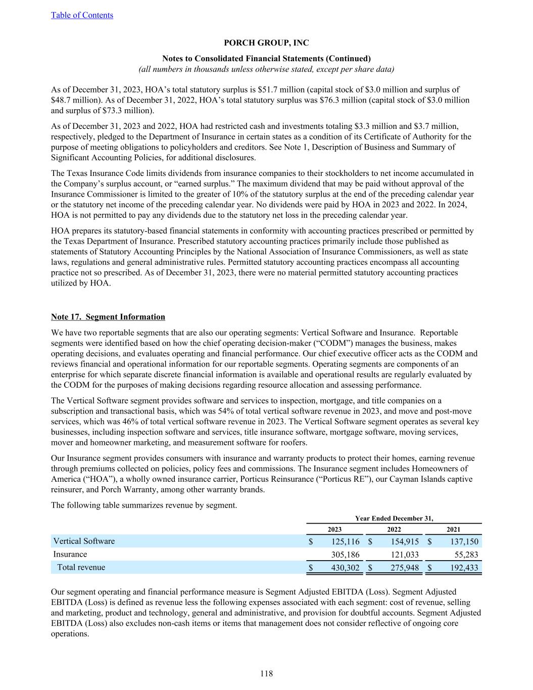 As of December 31, 2023, HOA’s total statutory surplus is $51.7 million (capital stock of $3.0 million and surplus of $48.7 million). As of December 31, 2022, HOA’s total statutory surplus was $76.3 million (capital stock of $3.0 million and surplus of $73.3 million). As of December 31, 2023 and 2022, HOA had restricted cash and investments totaling $3.3 million and $3.7 million, respectively, pledged to the Department of Insurance in certain states as a condition of its Certificate of Authority for the purpose of meeting obligations to policyholders and creditors. See Note 1, Description of Business and Summary of Significant Accounting Policies, for additional disclosures. The Texas Insurance Code limits dividends from insurance companies to their stockholders to net income accumulated in the Company’s surplus account, or “earned surplus.” The maximum dividend that may be paid without approval of the Insurance Commissioner is limited to the greater of 10% of the statutory surplus at the end of the preceding calendar year or the statutory net income of the preceding calendar year. No dividends were paid by HOA in 2023 and 2022. In 2024, HOA is not permitted to pay any dividends due to the statutory net loss in the preceding calendar year. HOA prepares its statutory-based financial statements in conformity with accounting practices prescribed or permitted by the Texas Department of Insurance. Prescribed statutory accounting practices primarily include those published as statements of Statutory Accounting Principles by the National Association of Insurance Commissioners, as well as state laws, regulations and general administrative rules. Permitted statutory accounting practices encompass all accounting practice not so prescribed. As of December 31, 2023, there were no material permitted statutory accounting practices utilized by HOA. Note 17. Segment Information We have two reportable segments that are also our operating segments: Vertical Software and Insurance. Reportable segments were identified based on how the chief operating decision-maker (“CODM”) manages the business, makes operating decisions, and evaluates operating and financial performance. Our chief executive officer acts as the CODM and reviews financial and operational information for our reportable segments. Operating segments are components of an enterprise for which separate discrete financial information is available and operational results are regularly evaluated by the CODM for the purposes of making decisions regarding resource allocation and assessing performance. The Vertical Software segment provides software and services to inspection, mortgage, and title companies on a subscription and transactional basis, which was 54% of total vertical software revenue in 2023, and move and post-move services, which was 46% of total vertical software revenue in 2023. The Vertical Software segment operates as several key businesses, including inspection software and services, title insurance software, mortgage software, moving services, mover and homeowner marketing, and measurement software for roofers. Our Insurance segment provides consumers with insurance and warranty products to protect their homes, earning revenue through premiums collected on policies, policy fees and commissions. The Insurance segment includes Homeowners of America (“HOA”), a wholly owned insurance carrier, Porticus Reinsurance (“Porticus RE”), our Cayman Islands captive reinsurer, and Porch Warranty, among other warranty brands. The following table summarizes revenue by segment. Year Ended December 31, 2023 2022 2021 Vertical Software $ 125,116 $ 154,915 $ 137,150 Insurance 305,186 121,033 55,283 Total revenue $ 430,302 $ 275,948 $ 192,433 Our segment operating and financial performance measure is Segment Adjusted EBITDA (Loss). Segment Adjusted EBITDA (Loss) is defined as revenue less the following expenses associated with each segment: cost of revenue, selling and marketing, product and technology, general and administrative, and provision for doubtful accounts. Segment Adjusted EBITDA (Loss) also excludes non-cash items or items that management does not consider reflective of ongoing core operations. Table of Contents PORCH GROUP, INC Notes to Consolidated Financial Statements (Continued) (all numbers in thousands unless otherwise stated, except per share data) 118