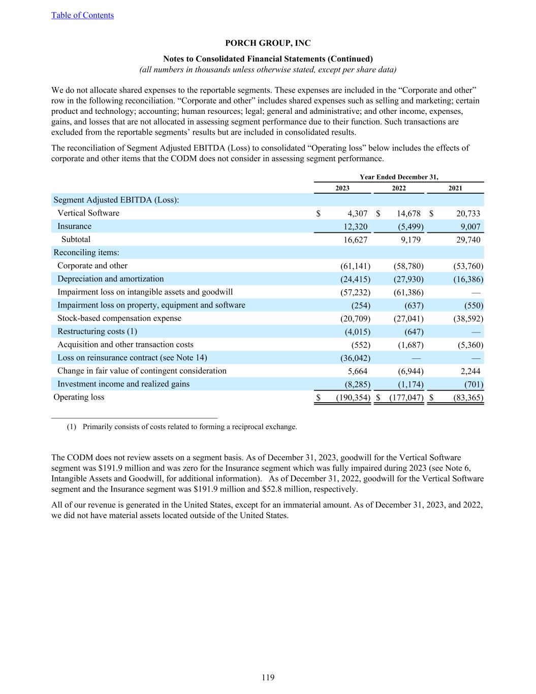 We do not allocate shared expenses to the reportable segments. These expenses are included in the “Corporate and other” row in the following reconciliation. “Corporate and other” includes shared expenses such as selling and marketing; certain product and technology; accounting; human resources; legal; general and administrative; and other income, expenses, gains, and losses that are not allocated in assessing segment performance due to their function. Such transactions are excluded from the reportable segments’ results but are included in consolidated results. The reconciliation of Segment Adjusted EBITDA (Loss) to consolidated “Operating loss” below includes the effects of corporate and other items that the CODM does not consider in assessing segment performance. Year Ended December 31, 2023 2022 2021 Segment Adjusted EBITDA (Loss): Vertical Software $ 4,307 $ 14,678 $ 20,733 Insurance 12,320 (5,499) 9,007 Subtotal 16,627 9,179 29,740 Reconciling items: Corporate and other (61,141) (58,780) (53,760) Depreciation and amortization (24,415) (27,930) (16,386) Impairment loss on intangible assets and goodwill (57,232) (61,386) — Impairment loss on property, equipment and software (254) (637) (550) Stock-based compensation expense (20,709) (27,041) (38,592) Restructuring costs (1) (4,015) (647) — Acquisition and other transaction costs (552) (1,687) (5,360) Loss on reinsurance contract (see Note 14) (36,042) — — Change in fair value of contingent consideration 5,664 (6,944) 2,244 Investment income and realized gains (8,285) (1,174) (701) Operating loss $ (190,354) $ (177,047) $ (83,365) ______________________________________ (1) Primarily consists of costs related to forming a reciprocal exchange. The CODM does not review assets on a segment basis. As of December 31, 2023, goodwill for the Vertical Software segment was $191.9 million and was zero for the Insurance segment which was fully impaired during 2023 (see Note 6, Intangible Assets and Goodwill, for additional information). As of December 31, 2022, goodwill for the Vertical Software segment and the Insurance segment was $191.9 million and $52.8 million, respectively. All of our revenue is generated in the United States, except for an immaterial amount. As of December 31, 2023, and 2022, we did not have material assets located outside of the United States. Table of Contents PORCH GROUP, INC Notes to Consolidated Financial Statements (Continued) (all numbers in thousands unless otherwise stated, except per share data) 119