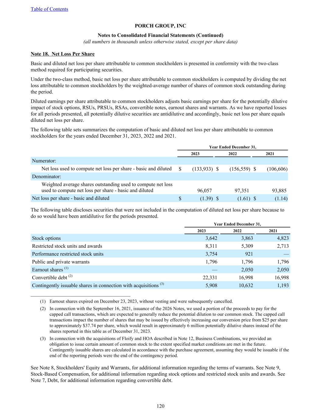 Note 18. Net Loss Per Share Basic and diluted net loss per share attributable to common stockholders is presented in conformity with the two-class method required for participating securities. Under the two-class method, basic net loss per share attributable to common stockholders is computed by dividing the net loss attributable to common stockholders by the weighted-average number of shares of common stock outstanding during the period. Diluted earnings per share attributable to common stockholders adjusts basic earnings per share for the potentially dilutive impact of stock options, RSUs, PRSUs, RSAs, convertible notes, earnout shares and warrants. As we have reported losses for all periods presented, all potentially dilutive securities are antidilutive and accordingly, basic net loss per share equals diluted net loss per share. The following table sets summarizes the computation of basic and diluted net loss per share attributable to common stockholders for the years ended December 31, 2023, 2022 and 2021. Year Ended December 31, 2023 2022 2021 Numerator: Net loss used to compute net loss per share - basic and diluted $ (133,933) $ (156,559) $ (106,606) Denominator: Weighted average shares outstanding used to compute net loss used to compute net loss per share - basic and diluted 96,057 97,351 93,885 Net loss per share - basic and diluted $ (1.39) $ (1.61) $ (1.14) The following table discloses securities that were not included in the computation of diluted net loss per share because to do so would have been antidilutive for the periods presented. Year Ended December 31, 2023 2022 2021 Stock options 3,642 3,863 4,823 Restricted stock units and awards 8,311 5,309 2,713 Performance restricted stock units 3,754 921 — Public and private warrants 1,796 1,796 1,796 Earnout shares (1) — 2,050 2,050 Convertible debt (2) 22,331 16,998 16,998 Contingently issuable shares in connection with acquisitions (3) 5,908 10,632 1,193 ______________________________________ (1) Earnout shares expired on December 23, 2023, without vesting and were subsequently cancelled. (2) In connection with the September 16, 2021, issuance of the 2026 Notes, we used a portion of the proceeds to pay for the capped call transactions, which are expected to generally reduce the potential dilution to our common stock. The capped call transactions impact the number of shares that may be issued by effectively increasing our conversion price from $25 per share to approximately $37.74 per share, which would result in approximately 6 million potentially dilutive shares instead of the shares reported in this table as of December 31, 2023. (3) In connection with the acquisitions of Floify and HOA described in Note 12, Business Combinations, we provided an obligation to issue certain amount of common stock to the extent specified market conditions are met in the future. Contingently issuable shares are calculated in accordance with the purchase agreement, assuming they would be issuable if the end of the reporting periods were the end of the contingency period. See Note 8, Stockholders' Equity and Warrants, for additional information regarding the terms of warrants. See Note 9, Stock-Based Compensation, for additional information regarding stock options and restricted stock units and awards. See Note 7, Debt, for additional information regarding convertible debt. Table of Contents PORCH GROUP, INC Notes to Consolidated Financial Statements (Continued) (all numbers in thousands unless otherwise stated, except per share data) 120