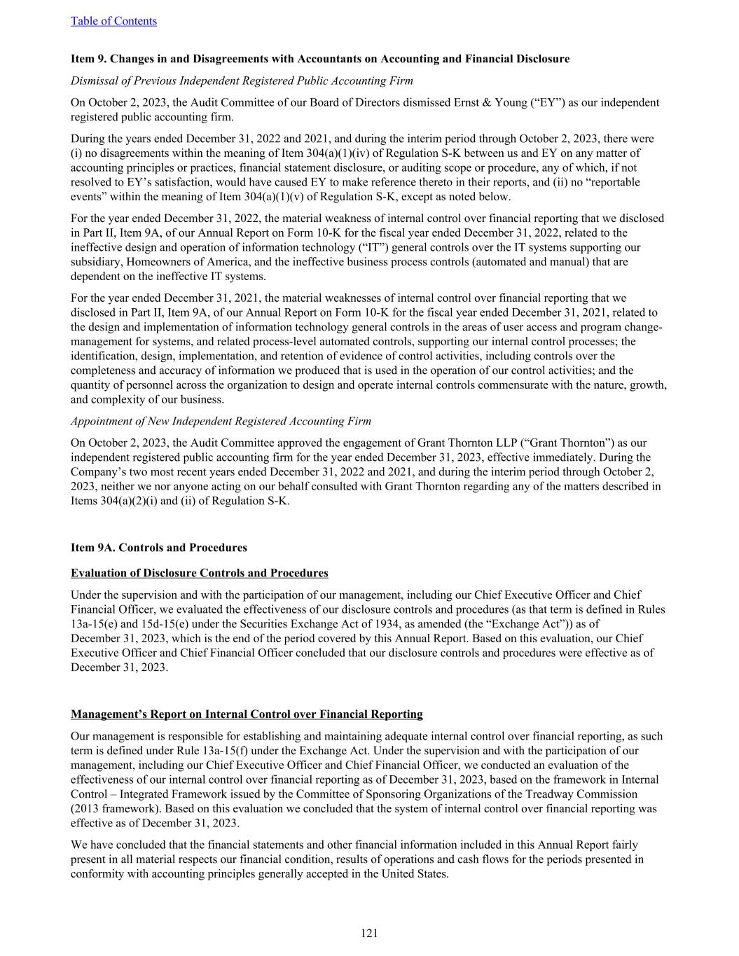 Item 9. Changes in and Disagreements with Accountants on Accounting and Financial Disclosure Dismissal of Previous Independent Registered Public Accounting Firm On October 2, 2023, the Audit Committee of our Board of Directors dismissed Ernst & Young (“EY”) as our independent registered public accounting firm. During the years ended December 31, 2022 and 2021, and during the interim period through October 2, 2023, there were (i) no disagreements within the meaning of Item 304(a)(1)(iv) of Regulation S-K between us and EY on any matter of accounting principles or practices, financial statement disclosure, or auditing scope or procedure, any of which, if not resolved to EY’s satisfaction, would have caused EY to make reference thereto in their reports, and (ii) no “reportable events” within the meaning of Item 304(a)(1)(v) of Regulation S-K, except as noted below. For the year ended December 31, 2022, the material weakness of internal control over financial reporting that we disclosed in Part II, Item 9A, of our Annual Report on Form 10-K for the fiscal year ended December 31, 2022, related to the ineffective design and operation of information technology (“IT”) general controls over the IT systems supporting our subsidiary, Homeowners of America, and the ineffective business process controls (automated and manual) that are dependent on the ineffective IT systems. For the year ended December 31, 2021, the material weaknesses of internal control over financial reporting that we disclosed in Part II, Item 9A, of our Annual Report on Form 10-K for the fiscal year ended December 31, 2021, related to the design and implementation of information technology general controls in the areas of user access and program change- management for systems, and related process-level automated controls, supporting our internal control processes; the identification, design, implementation, and retention of evidence of control activities, including controls over the completeness and accuracy of information we produced that is used in the operation of our control activities; and the quantity of personnel across the organization to design and operate internal controls commensurate with the nature, growth, and complexity of our business. Appointment of New Independent Registered Accounting Firm On October 2, 2023, the Audit Committee approved the engagement of Grant Thornton LLP (“Grant Thornton”) as our independent registered public accounting firm for the year ended December 31, 2023, effective immediately. During the Company’s two most recent years ended December 31, 2022 and 2021, and during the interim period through October 2, 2023, neither we nor anyone acting on our behalf consulted with Grant Thornton regarding any of the matters described in Items 304(a)(2)(i) and (ii) of Regulation S-K. Item 9A. Controls and Procedures Evaluation of Disclosure Controls and Procedures Under the supervision and with the participation of our management, including our Chief Executive Officer and Chief Financial Officer, we evaluated the effectiveness of our disclosure controls and procedures (as that term is defined in Rules 13a-15(e) and 15d-15(e) under the Securities Exchange Act of 1934, as amended (the “Exchange Act”)) as of December 31, 2023, which is the end of the period covered by this Annual Report. Based on this evaluation, our Chief Executive Officer and Chief Financial Officer concluded that our disclosure controls and procedures were effective as of December 31, 2023. Management’s Report on Internal Control over Financial Reporting Our management is responsible for establishing and maintaining adequate internal control over financial reporting, as such term is defined under Rule 13a-15(f) under the Exchange Act. Under the supervision and with the participation of our management, including our Chief Executive Officer and Chief Financial Officer, we conducted an evaluation of the effectiveness of our internal control over financial reporting as of December 31, 2023, based on the framework in Internal Control – Integrated Framework issued by the Committee of Sponsoring Organizations of the Treadway Commission (2013 framework). Based on this evaluation we concluded that the system of internal control over financial reporting was effective as of December 31, 2023. We have concluded that the financial statements and other financial information included in this Annual Report fairly present in all material respects our financial condition, results of operations and cash flows for the periods presented in conformity with accounting principles generally accepted in the United States. Table of Contents 121