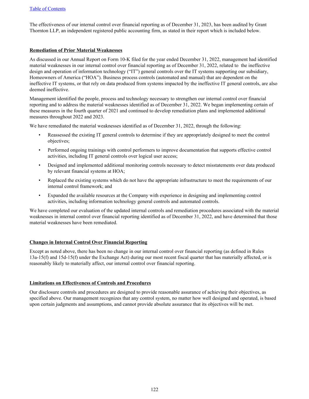 The effectiveness of our internal control over financial reporting as of December 31, 2023, has been audited by Grant Thornton LLP, an independent registered public accounting firm, as stated in their report which is included below. Remediation of Prior Material Weaknesses As discussed in our Annual Report on Form 10-K filed for the year ended December 31, 2022, management had identified material weaknesses in our internal control over financial reporting as of December 31, 2022, related to the ineffective design and operation of information technology (“IT”) general controls over the IT systems supporting our subsidiary, Homeowners of America (“HOA”). Business process controls (automated and manual) that are dependent on the ineffective IT systems, or that rely on data produced from systems impacted by the ineffective IT general controls, are also deemed ineffective. Management identified the people, process and technology necessary to strengthen our internal control over financial reporting and to address the material weaknesses identified as of December 31, 2022. We began implementing certain of these measures in the fourth quarter of 2021 and continued to develop remediation plans and implemented additional measures throughout 2022 and 2023. We have remediated the material weaknesses identified as of December 31, 2022, through the following: • Reassessed the existing IT general controls to determine if they are appropriately designed to meet the control objectives; • Performed ongoing trainings with control performers to improve documentation that supports effective control activities, including IT general controls over logical user access; • Designed and implemented additional monitoring controls necessary to detect misstatements over data produced by relevant financial systems at HOA; • Replaced the existing systems which do not have the appropriate infrastructure to meet the requirements of our internal control framework; and • Expanded the available resources at the Company with experience in designing and implementing control activities, including information technology general controls and automated controls. We have completed our evaluation of the updated internal controls and remediation procedures associated with the material weaknesses in internal control over financial reporting identified as of December 31, 2022, and have determined that those material weaknesses have been remediated. Changes in Internal Control Over Financial Reporting Except as noted above, there has been no change in our internal control over financial reporting (as defined in Rules 13a-15(f) and 15d-15(f) under the Exchange Act) during our most recent fiscal quarter that has materially affected, or is reasonably likely to materially affect, our internal control over financial reporting. Limitations on Effectiveness of Controls and Procedures Our disclosure controls and procedures are designed to provide reasonable assurance of achieving their objectives, as specified above. Our management recognizes that any control system, no matter how well designed and operated, is based upon certain judgments and assumptions, and cannot provide absolute assurance that its objectives will be met. Table of Contents 122