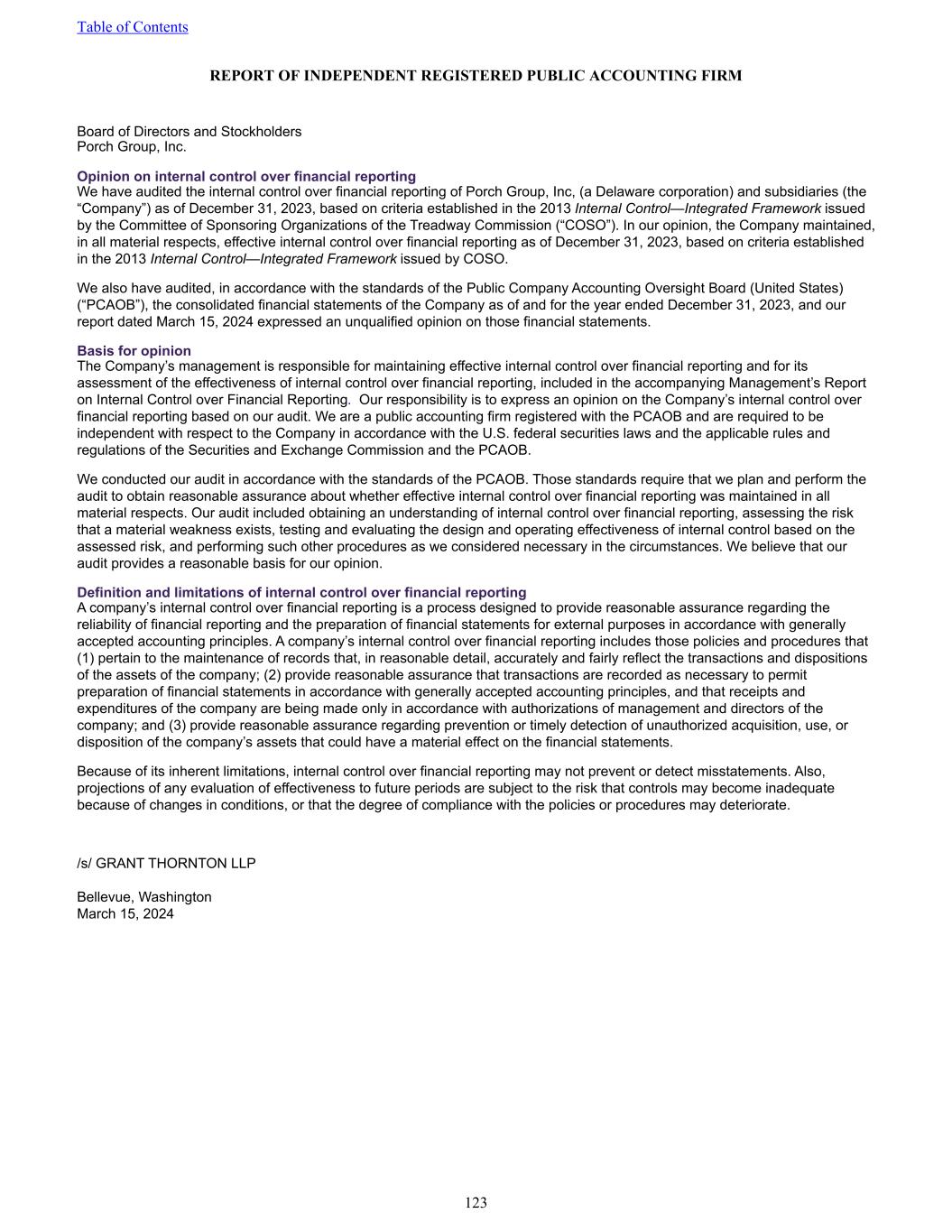 REPORT OF INDEPENDENT REGISTERED PUBLIC ACCOUNTING FIRM Board of Directors and Stockholders Porch Group, Inc. Opinion on internal control over financial reporting We have audited the internal control over financial reporting of Porch Group, Inc, (a Delaware corporation) and subsidiaries (the “Company”) as of December 31, 2023, based on criteria established in the 2013 Internal Control—Integrated Framework issued by the Committee of Sponsoring Organizations of the Treadway Commission (“COSO”). In our opinion, the Company maintained, in all material respects, effective internal control over financial reporting as of December 31, 2023, based on criteria established in the 2013 Internal Control—Integrated Framework issued by COSO. We also have audited, in accordance with the standards of the Public Company Accounting Oversight Board (United States) (“PCAOB”), the consolidated financial statements of the Company as of and for the year ended December 31, 2023, and our report dated March 15, 2024 expressed an unqualified opinion on those financial statements. Basis for opinion The Company’s management is responsible for maintaining effective internal control over financial reporting and for its assessment of the effectiveness of internal control over financial reporting, included in the accompanying Management’s Report on Internal Control over Financial Reporting. Our responsibility is to express an opinion on the Company’s internal control over financial reporting based on our audit. We are a public accounting firm registered with the PCAOB and are required to be independent with respect to the Company in accordance with the U.S. federal securities laws and the applicable rules and regulations of the Securities and Exchange Commission and the PCAOB. We conducted our audit in accordance with the standards of the PCAOB. Those standards require that we plan and perform the audit to obtain reasonable assurance about whether effective internal control over financial reporting was maintained in all material respects. Our audit included obtaining an understanding of internal control over financial reporting, assessing the risk that a material weakness exists, testing and evaluating the design and operating effectiveness of internal control based on the assessed risk, and performing such other procedures as we considered necessary in the circumstances. We believe that our audit provides a reasonable basis for our opinion. Definition and limitations of internal control over financial reporting A company’s internal control over financial reporting is a process designed to provide reasonable assurance regarding the reliability of financial reporting and the preparation of financial statements for external purposes in accordance with generally accepted accounting principles. A company’s internal control over financial reporting includes those policies and procedures that (1) pertain to the maintenance of records that, in reasonable detail, accurately and fairly reflect the transactions and dispositions of the assets of the company; (2) provide reasonable assurance that transactions are recorded as necessary to permit preparation of financial statements in accordance with generally accepted accounting principles, and that receipts and expenditures of the company are being made only in accordance with authorizations of management and directors of the company; and (3) provide reasonable assurance regarding prevention or timely detection of unauthorized acquisition, use, or disposition of the company’s assets that could have a material effect on the financial statements. Because of its inherent limitations, internal control over financial reporting may not prevent or detect misstatements. Also, projections of any evaluation of effectiveness to future periods are subject to the risk that controls may become inadequate because of changes in conditions, or that the degree of compliance with the policies or procedures may deteriorate. /s/ GRANT THORNTON LLP Bellevue, Washington March 15, 2024 Table of Contents 123