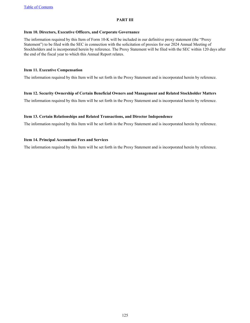 PART III Item 10. Directors, Executive Officers, and Corporate Governance The information required by this Item of Form 10-K will be included in our definitive proxy statement (the “Proxy Statement”) to be filed with the SEC in connection with the solicitation of proxies for our 2024 Annual Meeting of Stockholders and is incorporated herein by reference. The Proxy Statement will be filed with the SEC within 120 days after the end of the fiscal year to which this Annual Report relates. Item 11. Executive Compensation The information required by this Item will be set forth in the Proxy Statement and is incorporated herein by reference. Item 12. Security Ownership of Certain Beneficial Owners and Management and Related Stockholder Matters The information required by this Item will be set forth in the Proxy Statement and is incorporated herein by reference. Item 13. Certain Relationships and Related Transactions, and Director Independence The information required by this Item will be set forth in the Proxy Statement and is incorporated herein by reference. Item 14. Principal Accountant Fees and Services The information required by this Item will be set forth in the Proxy Statement and is incorporated herein by reference. Table of Contents 125