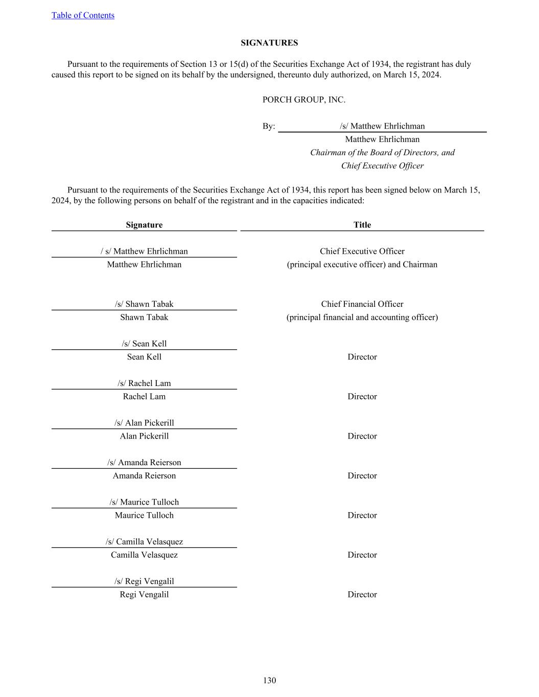 SIGNATURES Pursuant to the requirements of Section 13 or 15(d) of the Securities Exchange Act of 1934, the registrant has duly caused this report to be signed on its behalf by the undersigned, thereunto duly authorized, on March 15, 2024. PORCH GROUP, INC. By: /s/ Matthew Ehrlichman Matthew Ehrlichman Chairman of the Board of Directors, and Chief Executive Officer Pursuant to the requirements of the Securities Exchange Act of 1934, this report has been signed below on March 15, 2024, by the following persons on behalf of the registrant and in the capacities indicated: Signature Title / s/ Matthew Ehrlichman Chief Executive Officer Matthew Ehrlichman (principal executive officer) and Chairman /s/ Shawn Tabak Chief Financial Officer Shawn Tabak (principal financial and accounting officer) /s/ Sean Kell Sean Kell Director /s/ Rachel Lam Rachel Lam Director /s/ Alan Pickerill Alan Pickerill Director /s/ Amanda Reierson Amanda Reierson Director /s/ Maurice Tulloch Maurice Tulloch Director /s/ Camilla Velasquez Camilla Velasquez Director /s/ Regi Vengalil Regi Vengalil Director Table of Contents 130