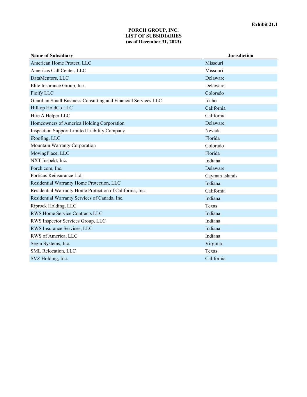 Exhibit 21.1 PORCH GROUP, INC. LIST OF SUBSIDIARIES (as of December 31, 2023) Name of Subsidiary Jurisdiction American Home Protect, LLC Missouri Americas Call Center, LLC Missouri DataMentors, LLC Delaware Elite Insurance Group, Inc. Delaware Floify LLC Colorado Guardian Small Business Consulting and Financial Services LLC Idaho Hilltop HoldCo LLC California Hire A Helper LLC California Homeowners of America Holding Corporation Delaware Inspection Support Limited Liability Company Nevada iRoofing, LLC Florida Mountain Warranty Corporation Colorado MovingPlace, LLC Florida NXT Inspekt, Inc. Indiana Porch.com, Inc. Delaware Porticus Reinsurance Ltd. Cayman Islands Residential Warranty Home Protection, LLC Indiana Residential Warranty Home Protection of California, Inc. California Residential Warranty Services of Canada, Inc. Indiana Riprock Holding, LLC Texas RWS Home Service Contracts LLC Indiana RWS Inspector Services Group, LLC Indiana RWS Insurance Services, LLC Indiana RWS of America, LLC Indiana Segin Systems, Inc. Virginia SML Relocation, LLC Texas SVZ Holding, Inc. California