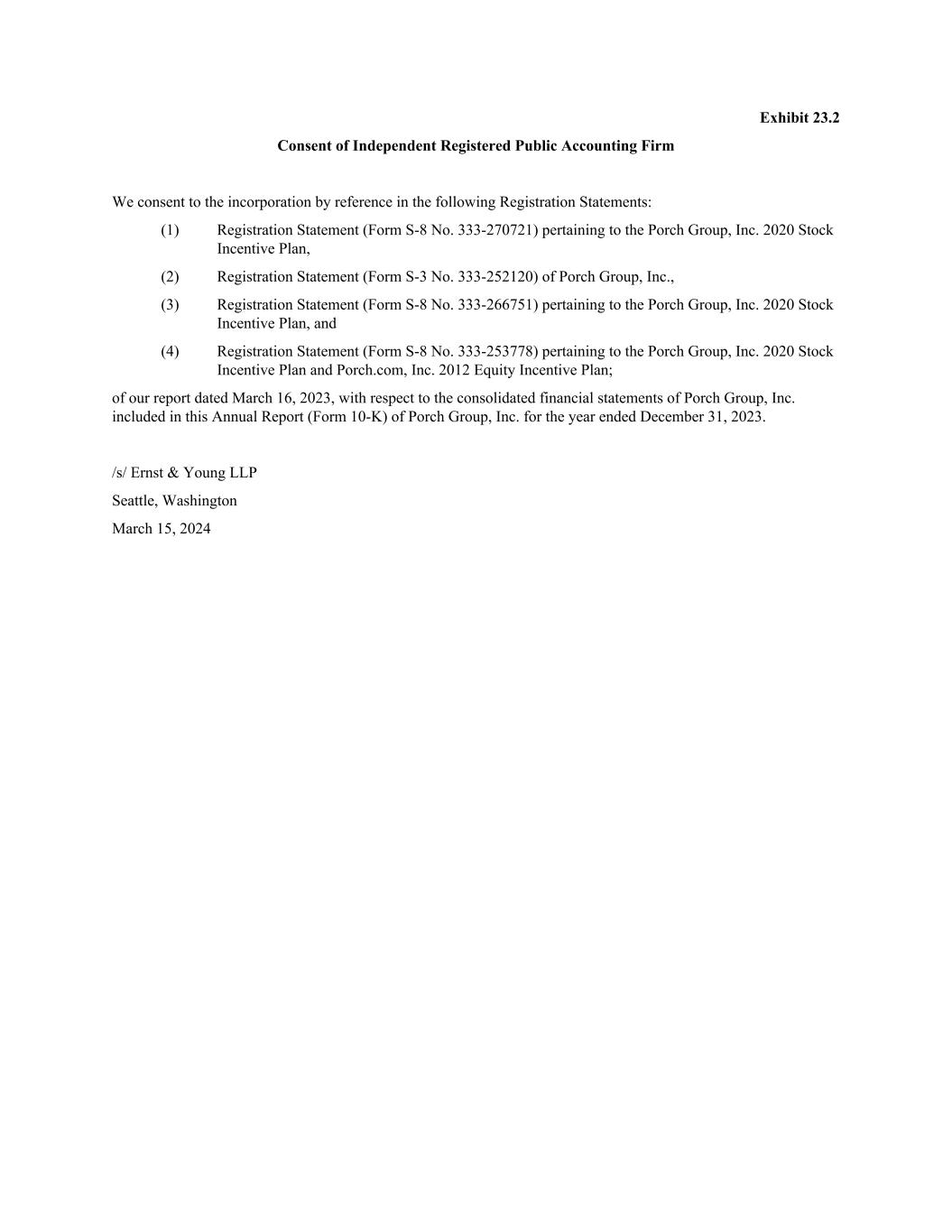 Exhibit 23.2 Consent of Independent Registered Public Accounting Firm We consent to the incorporation by reference in the following Registration Statements: (1) Registration Statement (Form S-8 No. 333-270721) pertaining to the Porch Group, Inc. 2020 Stock Incentive Plan, (2) Registration Statement (Form S-3 No. 333-252120) of Porch Group, Inc., (3) Registration Statement (Form S-8 No. 333-266751) pertaining to the Porch Group, Inc. 2020 Stock Incentive Plan, and (4) Registration Statement (Form S-8 No. 333-253778) pertaining to the Porch Group, Inc. 2020 Stock Incentive Plan and Porch.com, Inc. 2012 Equity Incentive Plan; of our report dated March 16, 2023, with respect to the consolidated financial statements of Porch Group, Inc. included in this Annual Report (Form 10-K) of Porch Group, Inc. for the year ended December 31, 2023. /s/ Ernst & Young LLP Seattle, Washington March 15, 2024