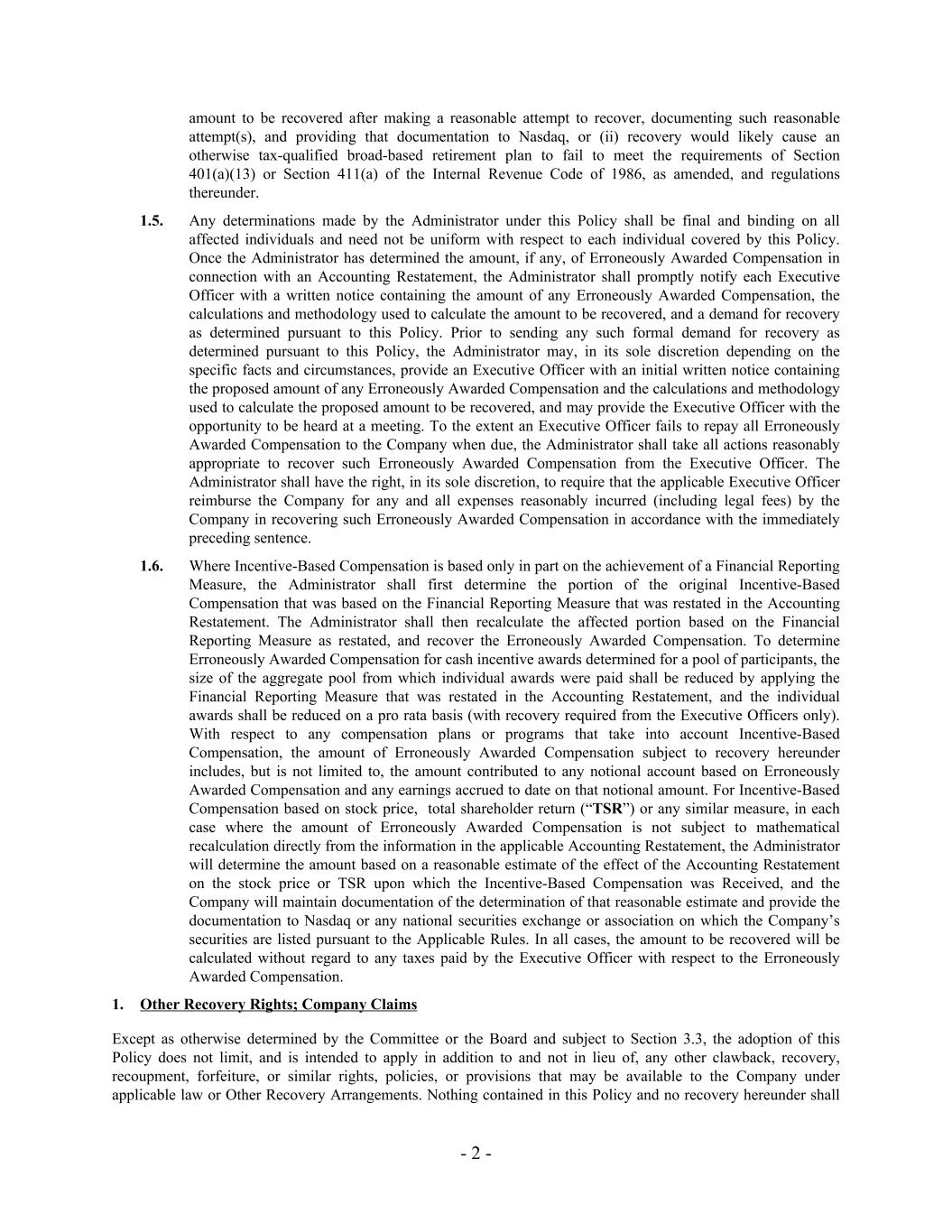 amount to be recovered after making a reasonable attempt to recover, documenting such reasonable attempt(s), and providing that documentation to Nasdaq, or (ii) recovery would likely cause an otherwise tax-qualified broad-based retirement plan to fail to meet the requirements of Section 401(a)(13) or Section 411(a) of the Internal Revenue Code of 1986, as amended, and regulations thereunder. 1.5. Any determinations made by the Administrator under this Policy shall be final and binding on all affected individuals and need not be uniform with respect to each individual covered by this Policy. Once the Administrator has determined the amount, if any, of Erroneously Awarded Compensation in connection with an Accounting Restatement, the Administrator shall promptly notify each Executive Officer with a written notice containing the amount of any Erroneously Awarded Compensation, the calculations and methodology used to calculate the amount to be recovered, and a demand for recovery as determined pursuant to this Policy. Prior to sending any such formal demand for recovery as determined pursuant to this Policy, the Administrator may, in its sole discretion depending on the specific facts and circumstances, provide an Executive Officer with an initial written notice containing the proposed amount of any Erroneously Awarded Compensation and the calculations and methodology used to calculate the proposed amount to be recovered, and may provide the Executive Officer with the opportunity to be heard at a meeting. To the extent an Executive Officer fails to repay all Erroneously Awarded Compensation to the Company when due, the Administrator shall take all actions reasonably appropriate to recover such Erroneously Awarded Compensation from the Executive Officer. The Administrator shall have the right, in its sole discretion, to require that the applicable Executive Officer reimburse the Company for any and all expenses reasonably incurred (including legal fees) by the Company in recovering such Erroneously Awarded Compensation in accordance with the immediately preceding sentence. 1.6. Where Incentive-Based Compensation is based only in part on the achievement of a Financial Reporting Measure, the Administrator shall first determine the portion of the original Incentive-Based Compensation that was based on the Financial Reporting Measure that was restated in the Accounting Restatement. The Administrator shall then recalculate the affected portion based on the Financial Reporting Measure as restated, and recover the Erroneously Awarded Compensation. To determine Erroneously Awarded Compensation for cash incentive awards determined for a pool of participants, the size of the aggregate pool from which individual awards were paid shall be reduced by applying the Financial Reporting Measure that was restated in the Accounting Restatement, and the individual awards shall be reduced on a pro rata basis (with recovery required from the Executive Officers only). With respect to any compensation plans or programs that take into account Incentive-Based Compensation, the amount of Erroneously Awarded Compensation subject to recovery hereunder includes, but is not limited to, the amount contributed to any notional account based on Erroneously Awarded Compensation and any earnings accrued to date on that notional amount. For Incentive-Based Compensation based on stock price, total shareholder return (“TSR”) or any similar measure, in each case where the amount of Erroneously Awarded Compensation is not subject to mathematical recalculation directly from the information in the applicable Accounting Restatement, the Administrator will determine the amount based on a reasonable estimate of the effect of the Accounting Restatement on the stock price or TSR upon which the Incentive-Based Compensation was Received, and the Company will maintain documentation of the determination of that reasonable estimate and provide the documentation to Nasdaq or any national securities exchange or association on which the Company’s securities are listed pursuant to the Applicable Rules. In all cases, the amount to be recovered will be calculated without regard to any taxes paid by the Executive Officer with respect to the Erroneously Awarded Compensation. 1. Other Recovery Rights; Company Claims Except as otherwise determined by the Committee or the Board and subject to Section 3.3, the adoption of this Policy does not limit, and is intended to apply in addition to and not in lieu of, any other clawback, recovery, recoupment, forfeiture, or similar rights, policies, or provisions that may be available to the Company under applicable law or Other Recovery Arrangements. Nothing contained in this Policy and no recovery hereunder shall - 2 -