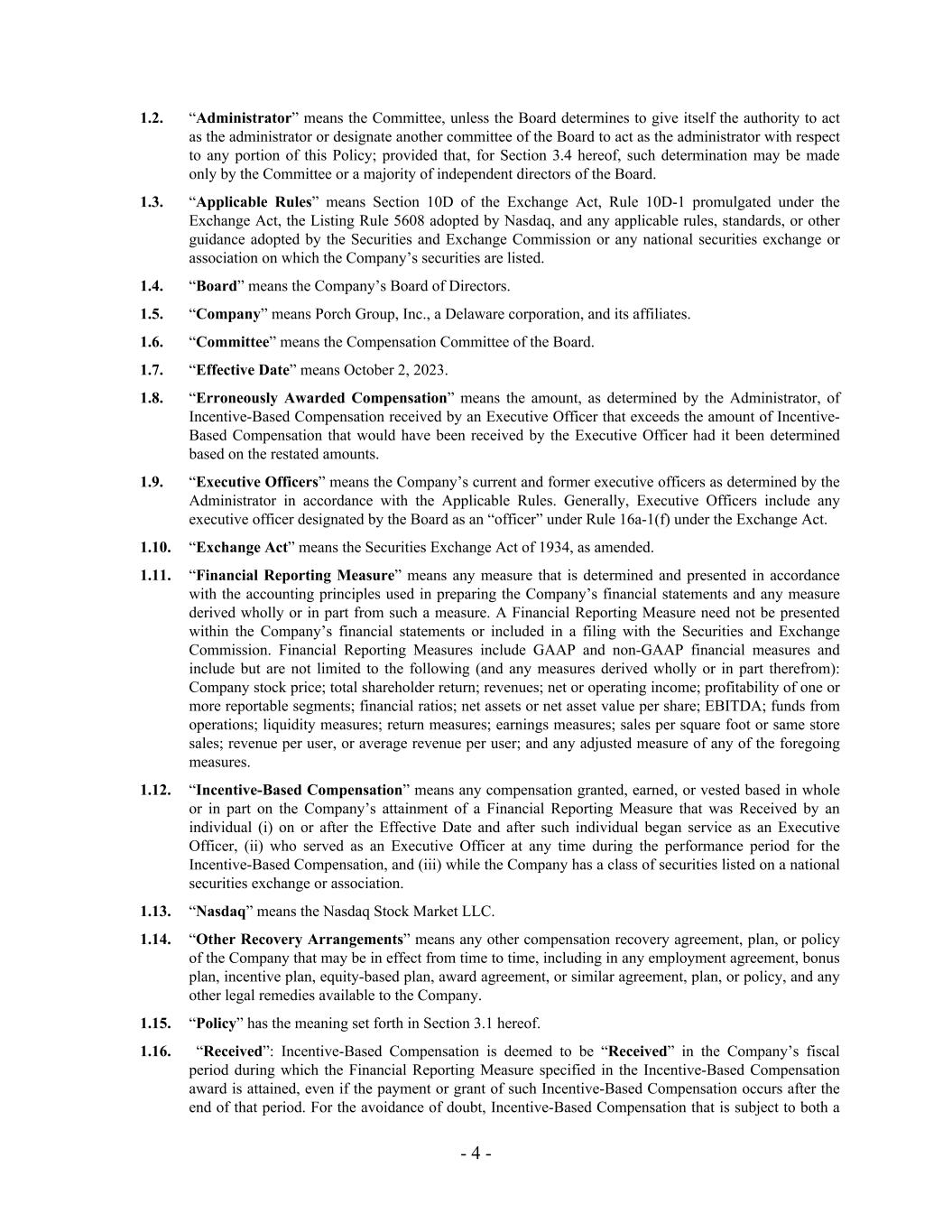 1.2. “Administrator” means the Committee, unless the Board determines to give itself the authority to act as the administrator or designate another committee of the Board to act as the administrator with respect to any portion of this Policy; provided that, for Section 3.4 hereof, such determination may be made only by the Committee or a majority of independent directors of the Board. 1.3. “Applicable Rules” means Section 10D of the Exchange Act, Rule 10D-1 promulgated under the Exchange Act, the Listing Rule 5608 adopted by Nasdaq, and any applicable rules, standards, or other guidance adopted by the Securities and Exchange Commission or any national securities exchange or association on which the Company’s securities are listed. 1.4. “Board” means the Company’s Board of Directors. 1.5. “Company” means Porch Group, Inc., a Delaware corporation, and its affiliates. 1.6. “Committee” means the Compensation Committee of the Board. 1.7. “Effective Date” means October 2, 2023. 1.8. “Erroneously Awarded Compensation” means the amount, as determined by the Administrator, of Incentive-Based Compensation received by an Executive Officer that exceeds the amount of Incentive- Based Compensation that would have been received by the Executive Officer had it been determined based on the restated amounts. 1.9. “Executive Officers” means the Company’s current and former executive officers as determined by the Administrator in accordance with the Applicable Rules. Generally, Executive Officers include any executive officer designated by the Board as an “officer” under Rule 16a-1(f) under the Exchange Act. 1.10. “Exchange Act” means the Securities Exchange Act of 1934, as amended. 1.11. “Financial Reporting Measure” means any measure that is determined and presented in accordance with the accounting principles used in preparing the Company’s financial statements and any measure derived wholly or in part from such a measure. A Financial Reporting Measure need not be presented within the Company’s financial statements or included in a filing with the Securities and Exchange Commission. Financial Reporting Measures include GAAP and non-GAAP financial measures and include but are not limited to the following (and any measures derived wholly or in part therefrom): Company stock price; total shareholder return; revenues; net or operating income; profitability of one or more reportable segments; financial ratios; net assets or net asset value per share; EBITDA; funds from operations; liquidity measures; return measures; earnings measures; sales per square foot or same store sales; revenue per user, or average revenue per user; and any adjusted measure of any of the foregoing measures. 1.12. “Incentive-Based Compensation” means any compensation granted, earned, or vested based in whole or in part on the Company’s attainment of a Financial Reporting Measure that was Received by an individual (i) on or after the Effective Date and after such individual began service as an Executive Officer, (ii) who served as an Executive Officer at any time during the performance period for the Incentive-Based Compensation, and (iii) while the Company has a class of securities listed on a national securities exchange or association. 1.13. “Nasdaq” means the Nasdaq Stock Market LLC. 1.14. “Other Recovery Arrangements” means any other compensation recovery agreement, plan, or policy of the Company that may be in effect from time to time, including in any employment agreement, bonus plan, incentive plan, equity-based plan, award agreement, or similar agreement, plan, or policy, and any other legal remedies available to the Company. 1.15. “Policy” has the meaning set forth in Section 3.1 hereof. 1.16. “Received”: Incentive-Based Compensation is deemed to be “Received” in the Company’s fiscal period during which the Financial Reporting Measure specified in the Incentive-Based Compensation award is attained, even if the payment or grant of such Incentive-Based Compensation occurs after the end of that period. For the avoidance of doubt, Incentive-Based Compensation that is subject to both a - 4 -