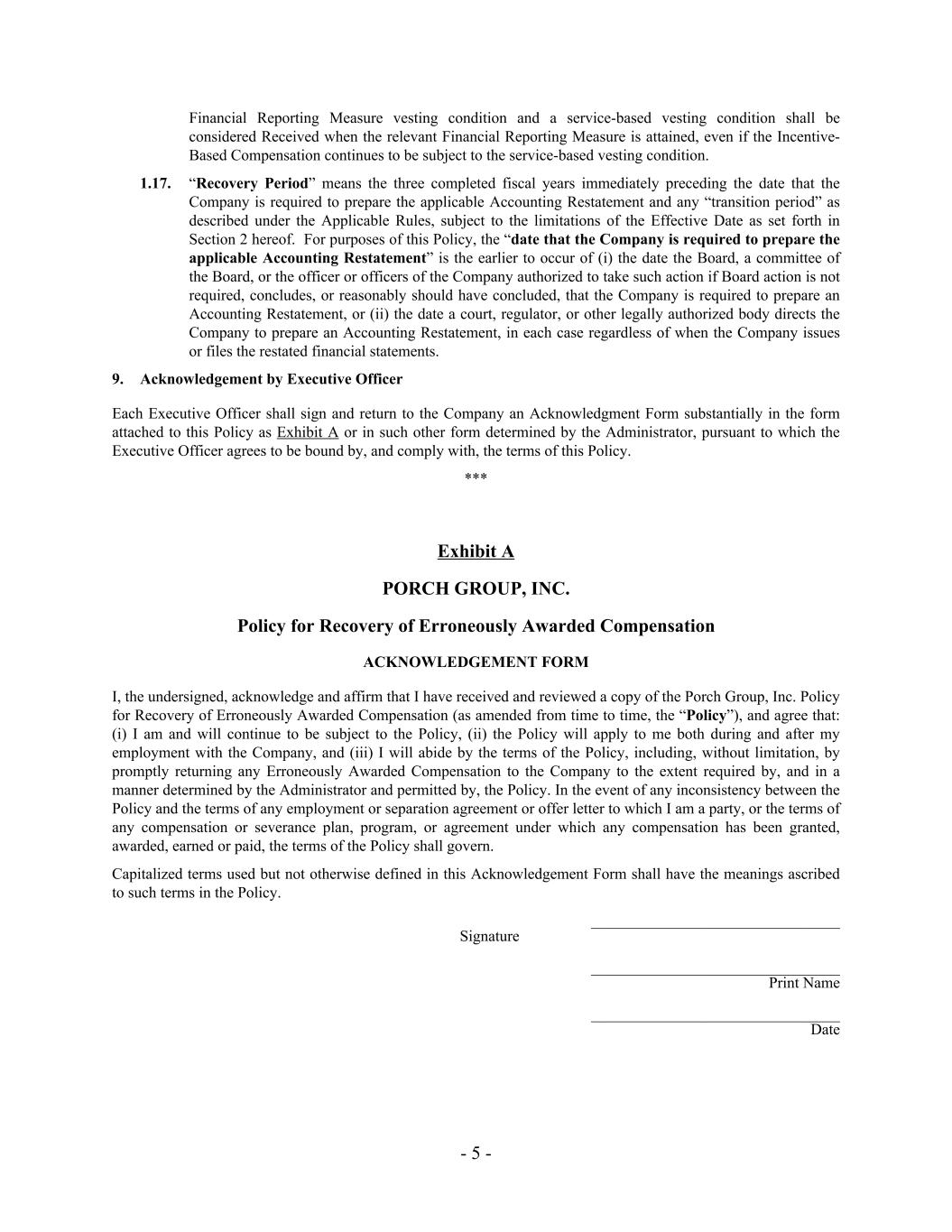 Financial Reporting Measure vesting condition and a service-based vesting condition shall be considered Received when the relevant Financial Reporting Measure is attained, even if the Incentive- Based Compensation continues to be subject to the service-based vesting condition. 1.17. “Recovery Period” means the three completed fiscal years immediately preceding the date that the Company is required to prepare the applicable Accounting Restatement and any “transition period” as described under the Applicable Rules, subject to the limitations of the Effective Date as set forth in Section 2 hereof. For purposes of this Policy, the “date that the Company is required to prepare the applicable Accounting Restatement” is the earlier to occur of (i) the date the Board, a committee of the Board, or the officer or officers of the Company authorized to take such action if Board action is not required, concludes, or reasonably should have concluded, that the Company is required to prepare an Accounting Restatement, or (ii) the date a court, regulator, or other legally authorized body directs the Company to prepare an Accounting Restatement, in each case regardless of when the Company issues or files the restated financial statements. 9. Acknowledgement by Executive Officer Each Executive Officer shall sign and return to the Company an Acknowledgment Form substantially in the form attached to this Policy as Exhibit A or in such other form determined by the Administrator, pursuant to which the Executive Officer agrees to be bound by, and comply with, the terms of this Policy. *** Exhibit A PORCH GROUP, INC. Policy for Recovery of Erroneously Awarded Compensation ACKNOWLEDGEMENT FORM I, the undersigned, acknowledge and affirm that I have received and reviewed a copy of the Porch Group, Inc. Policy for Recovery of Erroneously Awarded Compensation (as amended from time to time, the “Policy”), and agree that: (i) I am and will continue to be subject to the Policy, (ii) the Policy will apply to me both during and after my employment with the Company, and (iii) I will abide by the terms of the Policy, including, without limitation, by promptly returning any Erroneously Awarded Compensation to the Company to the extent required by, and in a manner determined by the Administrator and permitted by, the Policy. In the event of any inconsistency between the Policy and the terms of any employment or separation agreement or offer letter to which I am a party, or the terms of any compensation or severance plan, program, or agreement under which any compensation has been granted, awarded, earned or paid, the terms of the Policy shall govern. Capitalized terms used but not otherwise defined in this Acknowledgement Form shall have the meanings ascribed to such terms in the Policy. ________________________________ Signature ________________________________ Print Name ________________________________ Date - 5 -