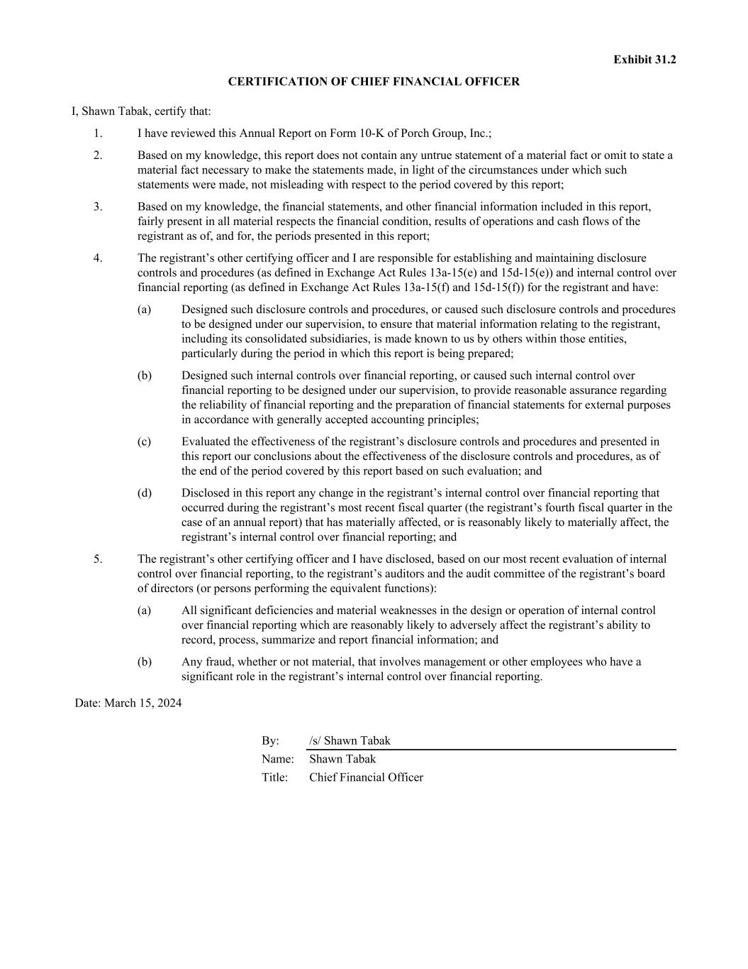 Exhibit 31.2 CERTIFICATION OF CHIEF FINANCIAL OFFICER I, Shawn Tabak, certify that: 1. I have reviewed this Annual Report on Form 10-K of Porch Group, Inc.; 2. Based on my knowledge, this report does not contain any untrue statement of a material fact or omit to state a material fact necessary to make the statements made, in light of the circumstances under which such statements were made, not misleading with respect to the period covered by this report; 3. Based on my knowledge, the financial statements, and other financial information included in this report, fairly present in all material respects the financial condition, results of operations and cash flows of the registrant as of, and for, the periods presented in this report; 4. The registrant’s other certifying officer and I are responsible for establishing and maintaining disclosure controls and procedures (as defined in Exchange Act Rules 13a-15(e) and 15d-15(e)) and internal control over financial reporting (as defined in Exchange Act Rules 13a-15(f) and 15d-15(f)) for the registrant and have: (a) Designed such disclosure controls and procedures, or caused such disclosure controls and procedures to be designed under our supervision, to ensure that material information relating to the registrant, including its consolidated subsidiaries, is made known to us by others within those entities, particularly during the period in which this report is being prepared; (b) Designed such internal controls over financial reporting, or caused such internal control over financial reporting to be designed under our supervision, to provide reasonable assurance regarding the reliability of financial reporting and the preparation of financial statements for external purposes in accordance with generally accepted accounting principles; (c) Evaluated the effectiveness of the registrant’s disclosure controls and procedures and presented in this report our conclusions about the effectiveness of the disclosure controls and procedures, as of the end of the period covered by this report based on such evaluation; and (d) Disclosed in this report any change in the registrant’s internal control over financial reporting that occurred during the registrant’s most recent fiscal quarter (the registrant’s fourth fiscal quarter in the case of an annual report) that has materially affected, or is reasonably likely to materially affect, the registrant’s internal control over financial reporting; and 5. The registrant’s other certifying officer and I have disclosed, based on our most recent evaluation of internal control over financial reporting, to the registrant’s auditors and the audit committee of the registrant’s board of directors (or persons performing the equivalent functions): (a) All significant deficiencies and material weaknesses in the design or operation of internal control over financial reporting which are reasonably likely to adversely affect the registrant’s ability to record, process, summarize and report financial information; and (b) Any fraud, whether or not material, that involves management or other employees who have a significant role in the registrant’s internal control over financial reporting. Date: March 15, 2024 By: /s/ Shawn Tabak Name: Shawn Tabak Title: Chief Financial Officer