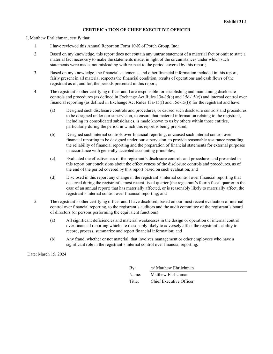 Exhibit 31.1 CERTIFICATION OF CHIEF EXECUTIVE OFFICER I, Matthew Ehrlichman, certify that: 1. I have reviewed this Annual Report on Form 10-K of Porch Group, Inc.; 2. Based on my knowledge, this report does not contain any untrue statement of a material fact or omit to state a material fact necessary to make the statements made, in light of the circumstances under which such statements were made, not misleading with respect to the period covered by this report; 3. Based on my knowledge, the financial statements, and other financial information included in this report, fairly present in all material respects the financial condition, results of operations and cash flows of the registrant as of, and for, the periods presented in this report; 4. The registrant’s other certifying officer and I are responsible for establishing and maintaining disclosure controls and procedures (as defined in Exchange Act Rules 13a-15(e) and 15d-15(e)) and internal control over financial reporting (as defined in Exchange Act Rules 13a-15(f) and 15d-15(f)) for the registrant and have: (a) Designed such disclosure controls and procedures, or caused such disclosure controls and procedures to be designed under our supervision, to ensure that material information relating to the registrant, including its consolidated subsidiaries, is made known to us by others within those entities, particularly during the period in which this report is being prepared; (b) Designed such internal controls over financial reporting, or caused such internal control over financial reporting to be designed under our supervision, to provide reasonable assurance regarding the reliability of financial reporting and the preparation of financial statements for external purposes in accordance with generally accepted accounting principles; (c) Evaluated the effectiveness of the registrant’s disclosure controls and procedures and presented in this report our conclusions about the effectiveness of the disclosure controls and procedures, as of the end of the period covered by this report based on such evaluation; and (d) Disclosed in this report any change in the registrant’s internal control over financial reporting that occurred during the registrant’s most recent fiscal quarter (the registrant’s fourth fiscal quarter in the case of an annual report) that has materially affected, or is reasonably likely to materially affect, the registrant’s internal control over financial reporting; and 5. The registrant’s other certifying officer and I have disclosed, based on our most recent evaluation of internal control over financial reporting, to the registrant’s auditors and the audit committee of the registrant’s board of directors (or persons performing the equivalent functions): (a) All significant deficiencies and material weaknesses in the design or operation of internal control over financial reporting which are reasonably likely to adversely affect the registrant’s ability to record, process, summarize and report financial information; and (b) Any fraud, whether or not material, that involves management or other employees who have a significant role in the registrant’s internal control over financial reporting. Date: March 15, 2024 By: /s/ Matthew Ehrlichman Name: Matthew Ehrlichman Title: Chief Executive Officer
