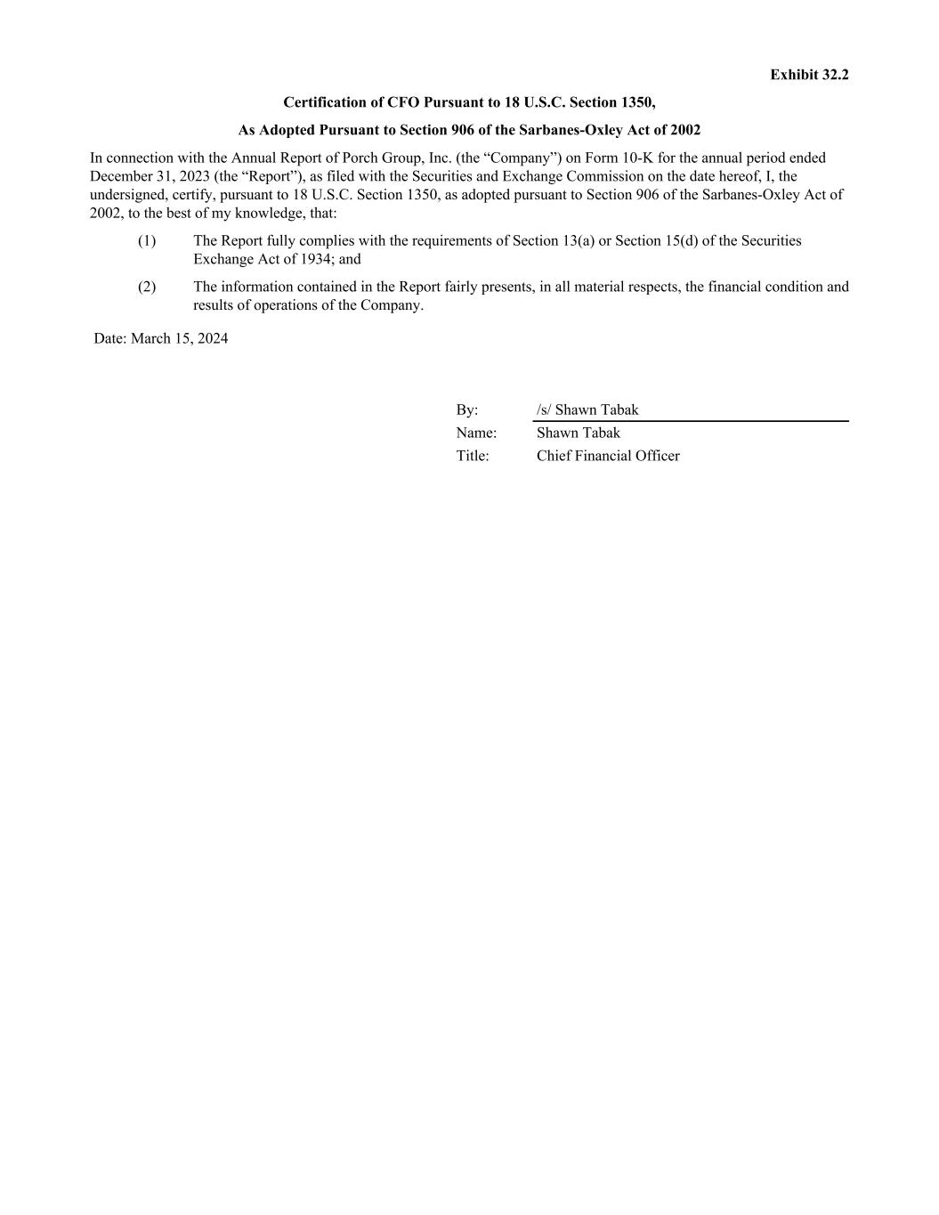 Exhibit 32.2 Certification of CFO Pursuant to 18 U.S.C. Section 1350, As Adopted Pursuant to Section 906 of the Sarbanes-Oxley Act of 2002 In connection with the Annual Report of Porch Group, Inc. (the “Company”) on Form 10-K for the annual period ended December 31, 2023 (the “Report”), as filed with the Securities and Exchange Commission on the date hereof, I, the undersigned, certify, pursuant to 18 U.S.C. Section 1350, as adopted pursuant to Section 906 of the Sarbanes-Oxley Act of 2002, to the best of my knowledge, that: (1) The Report fully complies with the requirements of Section 13(a) or Section 15(d) of the Securities Exchange Act of 1934; and (2) The information contained in the Report fairly presents, in all material respects, the financial condition and results of operations of the Company. Date: March 15, 2024 By: /s/ Shawn Tabak Name: Shawn Tabak Title: Chief Financial Officer