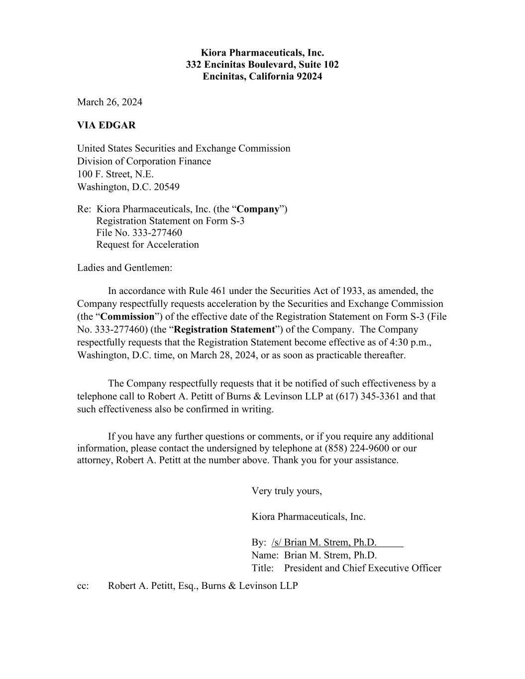 Kiora Pharmaceuticals, Inc. 332 Encinitas Boulevard, Suite 102 Encinitas, California 92024 March 26, 2024 VIA EDGAR United States Securities and Exchange Commission Division of Corporation Finance 100 F. Street, N.E. Washington, D.C. 20549 Re: Kiora Pharmaceuticals, Inc. (the “Company”) Registration Statement on Form S-3 File No. 333-277460 Request for Acceleration Ladies and Gentlemen: In accordance with Rule 461 under the Securities Act of 1933, as amended, the Company respectfully requests acceleration by the Securities and Exchange Commission (the “Commission”) of the effective date of the Registration Statement on Form S-3 (File No. 333-277460) (the “Registration Statement”) of the Company. The Company respectfully requests that the Registration Statement become effective as of 4:30 p.m., Washington, D.C. time, on March 28, 2024, or as soon as practicable thereafter. The Company respectfully requests that it be notified of such effectiveness by a telephone call to Robert A. Petitt of Burns & Levinson LLP at (617) 345-3361 and that such effectiveness also be confirmed in writing. If you have any further questions or comments, or if you require any additional information, please contact the undersigned by telephone at (858) 224-9600 or our attorney, Robert A. Petitt at the number above. Thank you for your assistance. Very truly yours, Kiora Pharmaceuticals, Inc. By: /s/ Brian M. Strem, Ph.D. Name: Brian M. Strem, Ph.D. Title: President and Chief Executive Officer cc: Robert A. Petitt, Esq., Burns & Levinson LLP