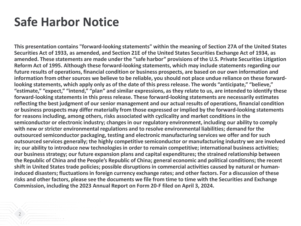 Safe Harbor Notice This presentation contains "forward - looking statements" within the meaning of Section 27A of the United States Securities Act of 1933, as amended, and Section 21E of the United States Securities Exchange Act of 1934, as amended. These statements are made under the “safe harbor” provisions of the U.S. Private Securities Litigation Reform Act of 1995. Although these forward - looking statements, which may include statements regarding our future results of operations, financial condition or business prospects, are based on our own information and information from other sources we believe to be reliable, you should not place undue reliance on these forward - looking statements, which apply only as of the date of this press release. The words “anticipate,” “believe,” “estimate,” “expect,” “intend,” “plan” and similar expressions, as they relate to us, are intended to identify these forward - looking statements in this press release. These forward - looking statements are necessarily estimates reflecting the best judgment of our senior management and our actual results of operations, financial condition or business prospects may differ materially from those expressed or implied by the forward - looking statements for reasons including, among others, risks associated with cyclicality and market conditions in the semiconductor or electronic industry; changes in our regulatory environment, including our ability to comply with new or stricter environmental regulations and to resolve environmental liabilities; demand for the outsourced semiconductor packaging, testing and electronic manufacturing services we offer and for such outsourced services generally; the highly competitive semiconductor or manufacturing industry we are involved in; our ability to introduce new technologies in order to remain competitive; international business activities; our business strategy; our future expansion plans and capital expenditures; the strained relationship between the Republic of China and the People’s Republic of China; general economic and political conditions; the recent shift in United States trade policies; possible disruptions in commercial activities caused by natural or human - induced disasters; fluctuations in foreign currency exchange rates; and other factors. For a discussion of these risks and other factors, please see the documents we file from time to time with the Securities and Exchange Commission, including the 2023 Annual Report on Form 20 - F filed on April 3, 2024 . 2
