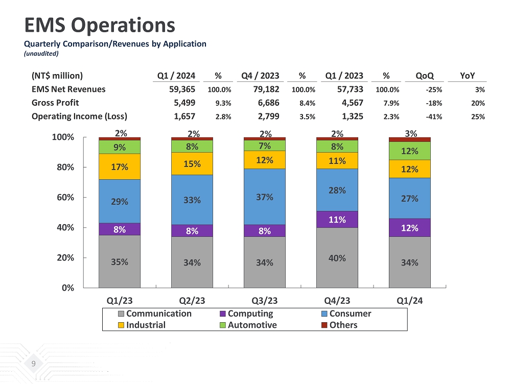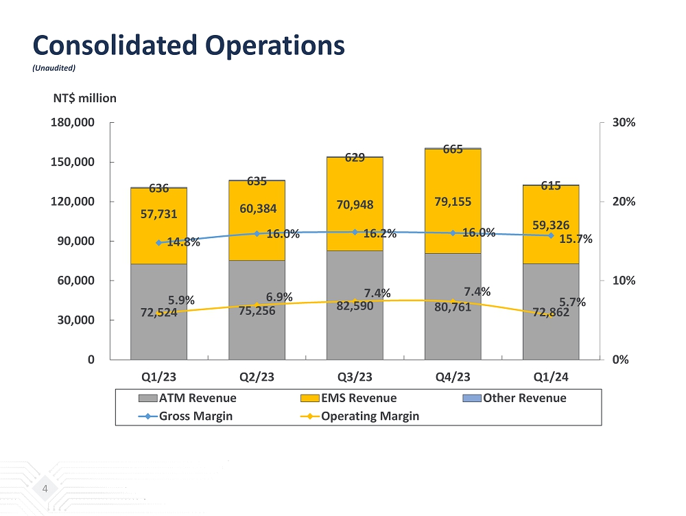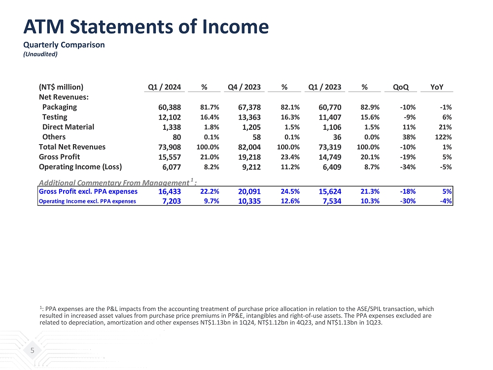 Consolidated Statements of Income Quarterly Comparison (Unaudited) 3 (NT$ million) Q1 / 2024 % Q4 / 2023 % Q1 / 2023 % QoQ YoY Net Revenues: ATM 72,862 54.9% 80,761 50.3% 72,524 55.4% -10% 0% EMS 59,326 44.7% 79,155 49.3% 57,731 44.1% -25% 3% Others 615 0.4% 665 0.4% 636 0.5% -8% -3% Total Net Revenues 132,803 100.0% 160,581 100.0% 130,891 100.0% -17% 1% Gross Profit 20,868 15.7% 25,761 16.0% 19,339 14.8% -19% 8% Operating Income (Loss) 7,525 5.7% 11,815 7.4% 7,695 5.9% -36% -2% Pretax Income (Loss) 7,860 5.9% 12,367 7.7% 7,870 6.0% -36% 0% Income Tax Benefit (Expense) (1,904) -1.4% (2,461) -1.5% (1,777) -1.4% Non-controlling Interests (274) -0.2% (514) -0.3% (276) -0.2% Net Income Attributable to Shareholders of the Parent 5,682 4.3% 9,392 5.8% 5,817 4.4% -40% -2% Basic EPS(NT$) 1.32 2.18 1.36 -39% -3% Diluted EPS(NT$) 1.28 2.13 1.30 -40% -2% Additional Commentary From Management 1&2 : Gross Profit excl. PPA expenses 21,775 16.4% 26,668 16.6% 20,256 15.5% -18% 7% Operating Income excl. PPA expenses 8,695 6.5% 12,984 8.1% 8,874 6.8% -33% -2% Net income attributable to shareholders of the parent excl. PPA expenses 6,834 5.1% 10,544 6.6% 6,980 5.3% -35% -2% Basic EPS(NT$) excl. PPA expenses 1.58 2.45 1.63 -36% -3% 1 : PPA expenses are the P&L impacts from the accounting treatment of purchase price allocation in relation to the ASE/SPIL trans act ion, which resulted in increased asset values from purchase price premiums in PP&E, intangibles and right - of - use assets. The PPA expenses excluded are related to depreciation, amortization and other expenses NT$1.13bn in 1Q24, NT$1.12bn in 4Q23 and NT$1.13bn in 1Q23. 2 : PPA expenses are the P&L impacts from the accounting treatment of purchase price allocation in relation to the USI/ Asteelflash transaction, which resulted in increased asset and liability values from purchase price premiums in PP&E, intangibles, right - of - use assets an d deferred tax liability. The PPA expenses excluded are related to depreciation, amortization, other expenses and income tax benefit NT$0.03bn in both 1Q24 and 4Q23, and NT$0.04bn in 1Q23.