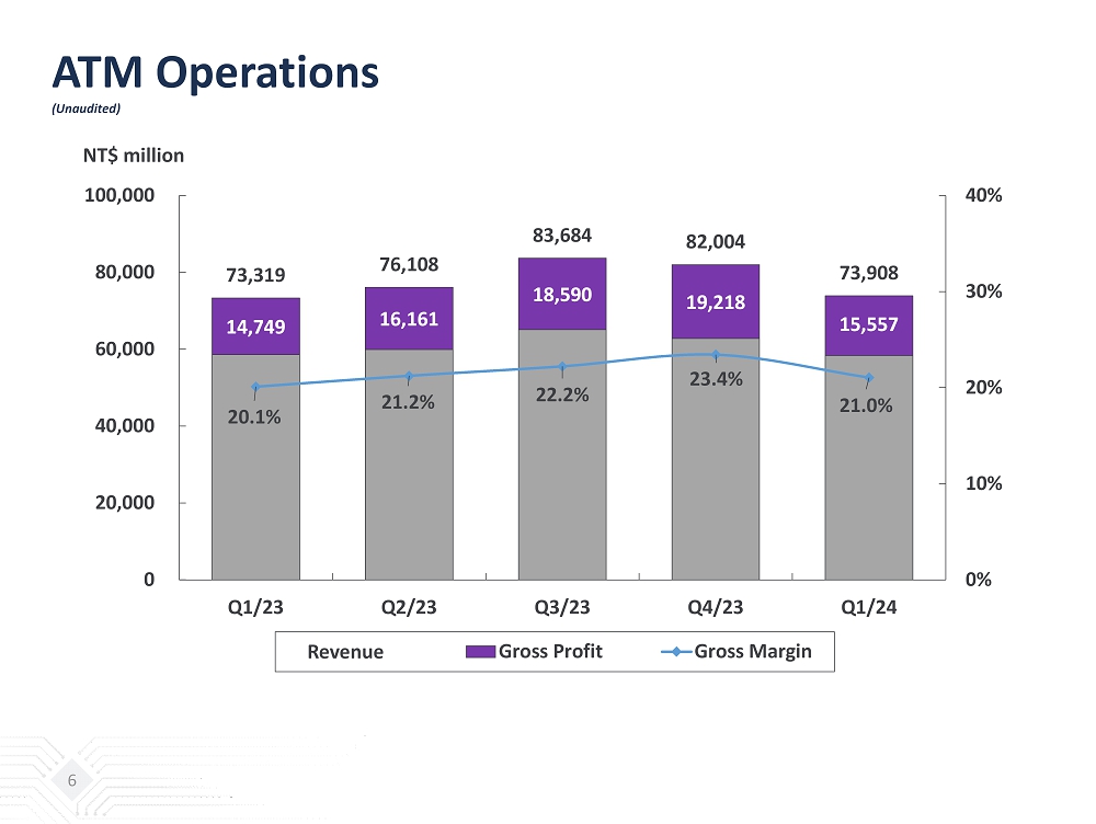 ATM Statements of Income Quarterly Comparison (Unaudited) 5 (NT$ million) Q1 / 2024 % Q4 / 2023 % Q1 / 2023 % QoQ YoY Net Revenues: Packaging 60,388 81.7% 67,378 82.1% 60,770 82.9% -10% -1% Testing 12,102 16.4% 13,363 16.3% 11,407 15.6% -9% 6% Direct Material 1,338 1.8% 1,205 1.5% 1,106 1.5% 11% 21% Others 80 0.1% 58 0.1% 36 0.0% 38% 122% Total Net Revenues 73,908 100.0% 82,004 100.0% 73,319 100.0% -10% 1% Gross Profit 15,557 21.0% 19,218 23.4% 14,749 20.1% -19% 5% Operating Income (Loss) 6,077 8.2% 9,212 11.2% 6,409 8.7% -34% -5% Additional Commentary From Management 1 : Gross Profit excl. PPA expenses 16,433 22.2% 20,091 24.5% 15,624 21.3% -18% 5% Operating Income excl. PPA expenses 7,203 9.7% 10,335 12.6% 7,534 10.3% -30% -4% 1 : PPA expenses are the P&L impacts from the accounting treatment of purchase price allocation in relation to the ASE/SPIL transacti on, which resulted in increased asset values from purchase price premiums in PP&E, intangibles and right - of - use assets. The PPA expenses e xcluded are related to depreciation, amortization and other expenses NT$1.13bn in 1Q24, NT$1.12bn in 4Q23, and NT$1.13bn in 1Q23.