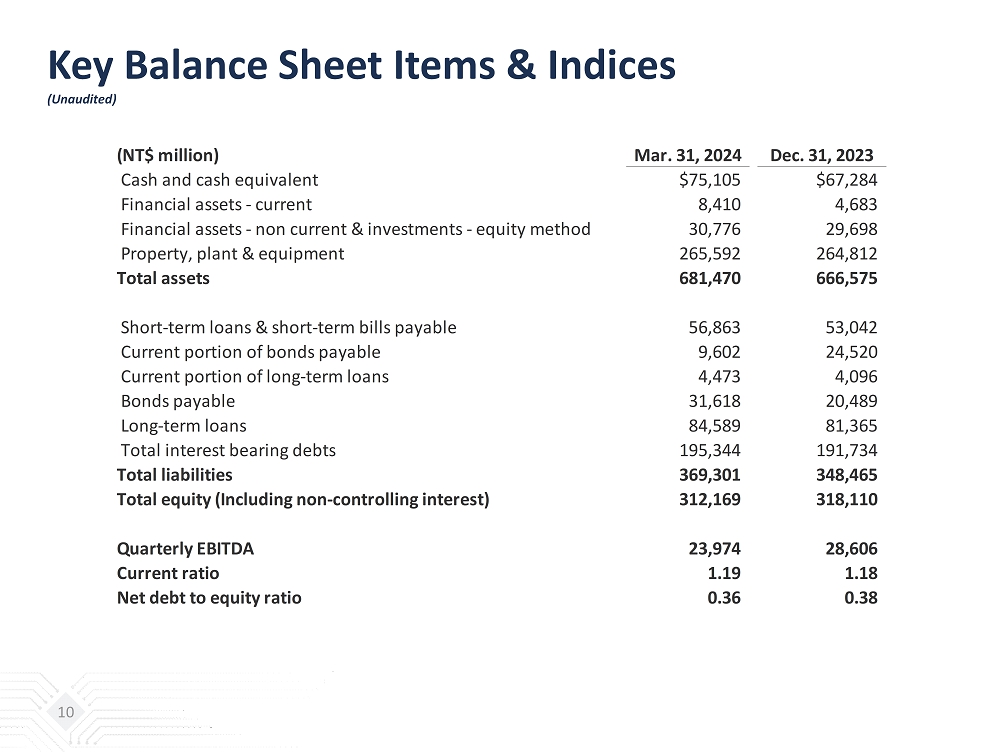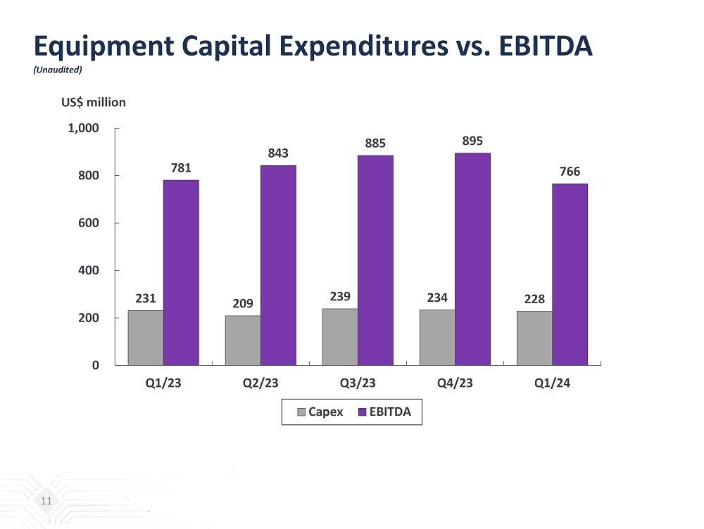 Key Balance Sheet Items & Indices (Unaudited) 10 (NT$ million) Mar. 31, 2024 Dec. 31, 2023 Cash and cash equivalent $75,105 $67,284 Financial assets - current 8,410 4,683 Financial assets - non current & investments - equity method 30,776 29,698 Property, plant & equipment 265,592 264,812 Total assets 681,470 666,575 Short-term loans & short-term bills payable 56,863 53,042 Current portion of bonds payable 9,602 24,520 Current portion of long-term loans 4,473 4,096 Bonds payable 31,618 20,489 Long-term loans 84,589 81,365 Total interest bearing debts 195,344 191,734 Total liabilities 369,301 348,465 Total equity (Including non-controlling interest) 312,169 318,110 Quarterly EBITDA 23,974 28,606 Current ratio 1.19 1.18 Net debt to equity ratio 0.36 0.38