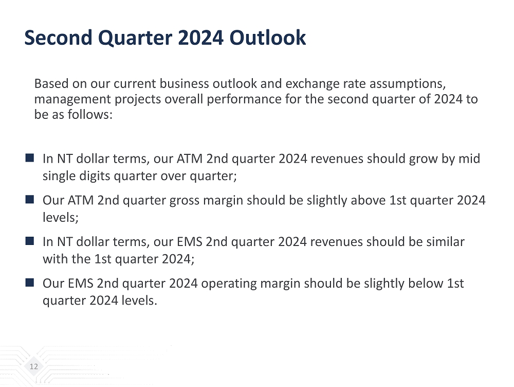 Second Quarter 2024 Outlook Based on our current business outlook and exchange rate assumptions, management projects overall performance for the second quarter of 2024 to be as follows: In NT dollar terms, our ATM 2nd quarter 2024 revenues should grow by mid single digits quarter over quarter; Our ATM 2nd quarter gross margin should be slightly above 1st quarter 2024 levels; In NT dollar terms, our EMS 2nd quarter 2024 revenues should be similar with the 1st quarter 2024; Our EMS 2nd quarter 2024 operating margin should be slightly below 1st quarter 2024 levels. 12