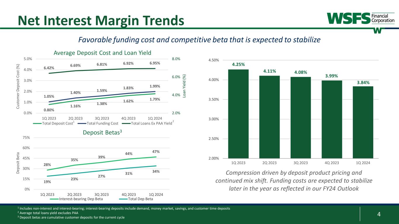 3 Financial Highlights 1Q 2024 Highlights: • Gross loans increased $212mm or 7% (annualized) • Growth across Commercial and Consumer segments • Customer deposits declined $235mm or 6% (annualized) • Expected declines in Trust and a short-term Commercial deposit partially offset by Consumer and Wealth growth • Core fee revenue1 of $76.5mm; continued growth opportunities • Increased 3% QoQ when excluding the income from equity in Spring EQ in 4Q23 • NIM of 3.84% in line with Outlook; reflects increased funding costs • Credit metrics stable with improvements in nonperforming assets (down 4bps to 0.33%) and net charge-offs (down 19bps to 0.27%) • Reported financials includes $1.3mm FDIC Special Assessment 1 These are non-GAAP financial measures and should be considered along with results prepared in accordance with GAAP, and not as a substitute for GAAP results. See Appendix for reconciliation to GAAP financial information. 2 Excludes net income that is attributable to noncontrolling interest Reported Core1 $ in millions (except per share amounts) 1Q24 4Q23 1Q24 4Q23 EPS $1.09 $1.05 $1.11 $1.15 ROA 1.28% 1.25% 1.31% 1.36% Net Income2 $65.8 $63.9 $67.3 $69.7 PPNR %1 1.98% 2.30% 2.02% 2.27% ROTCE1 18.76% 20.83% 19.19% 22.63% NIM 3.84% 3.99% 3.84% 3.99% Fee Revenue %3 30.2% 32.8% 30.3% 30.4% Efficiency Ratio 59.3% 55.6% 58.6% 54.5% ACL Ratio4 1.48% 1.46% 1.48% 1.46% Bank CET1 14.00% 13.72% 14.00% 13.72% 3 Tax-equivalent 4 ACL Ratio excludes HTM securities