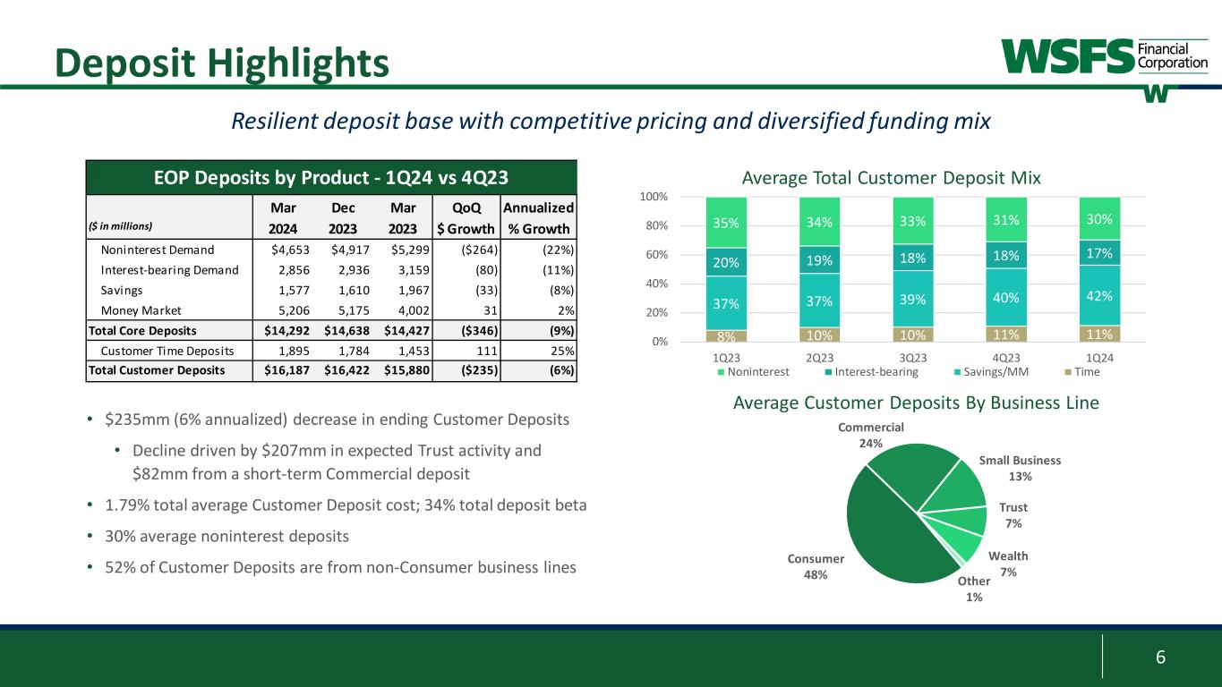 •Customer deposits decreased by $235.2 million, or 1% (6% annualized) for the quarter, primarily driven by a $207.4 million decrease in expected trust deposit activity and $81.9 million from a short-term commercial deposit.