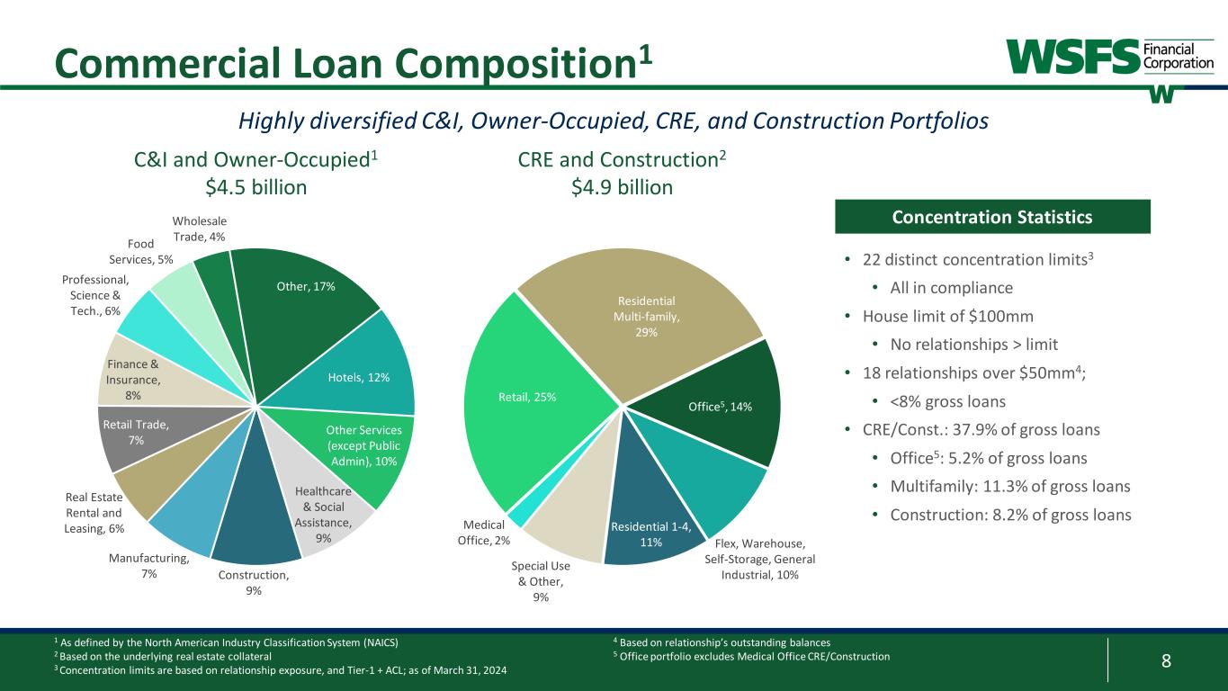 7 Loan Portfolio Highlights • Commercial: Growth driven by CRE new fundings and C&I originations; partially offset by payoffs and paydowns • Lowest quarterly payoffs/paydowns in over five years • Line utilization to 38.3%, up from 36.9% last quarter • Consumer: Driven by $59mm increase in Spring EQ loans, partially offset by $11mm decline in Upstart loans • Non-WSFS Customer Upstart originations paused; Upstart portfolio stands at $218mm and is expected to decline going forward 7% annualized gross loan growth across Commercial and Consumer segments 1 Includes new loans, existing new funding, paydowns, payoffs, and prior Commercial runoff portfolios. Excludes reclasses, HFS, purchase accounting mark/unearned changes, and Commercial leases 2 C&I loans includes Owner-Occupied Real Estate $461 $376 $442 $400 $326 ($315) ($491) ($289) ($379) ($241) $(600) $(400) $(200) - $200 $400 $600 1Q23 2Q23 3Q23 4Q23 1Q24 New Loans Fundings Paydown/Payoffs Commercial Portfolio: New Net Loan Fundings ($mm)1 ($ in millions) Mar 2024 Dec 2023 Mar 2023 1Q24 $ Growth Annualized % Growth C & I Loans2 $4,489 $4,443 $4,443 $46 4% Commercial Mortgages (CRE) 3,877 3,801 3,473 76 8% Construction Loans 1,056 1,036 1,024 20 8% Commercial Leases 634 624 577 10 6% Total Commercial Loans $10,056 $9,904 $9,517 $152 6% Residential Mortgage (HFS/HFI) 888 882 801 6 3% Consumer Loans 2,066 2,012 1,868 54 11% Total Gross Loans $13,010 $12,798 $12,186 $212 7% EOP Loans - 1Q24 vs 4Q23