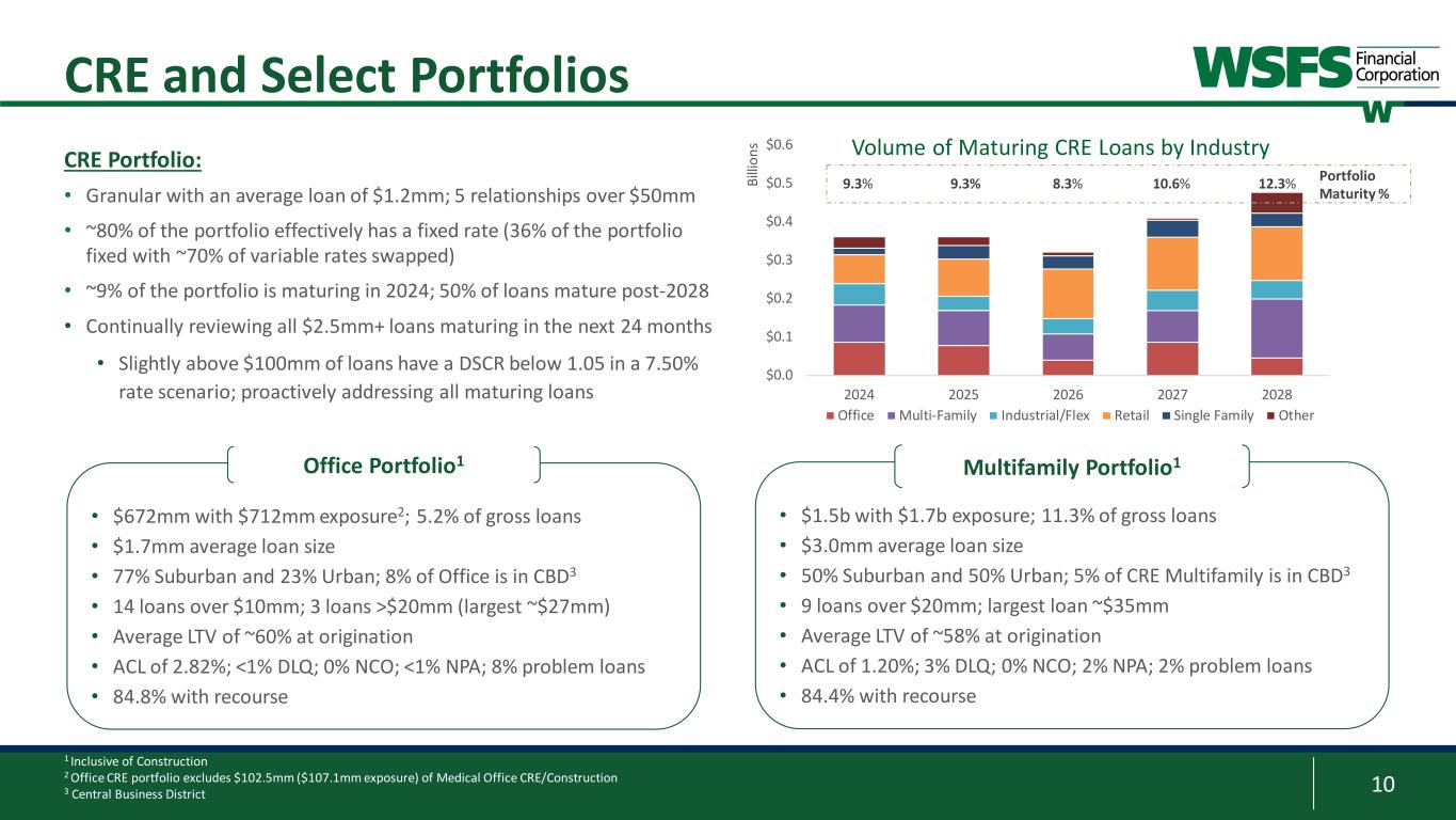 9 Stable Asset Quality Metrics $417 $465 $543 $556 $573 3.42% 3.76% 4.27% 4.34% 4.41% -2% 0% 2% 4% 6% 8% $300 $400 $500 $600 $700 $800 1Q23 2Q23 3Q23 4Q23 1Q24 M ill io ns Problem Assets % of Gross Loans Problem Assets $33 $34 $58 $76 $67 0.16% 0.16% 0.29% 0.37% 0.33% 0.0% 0.1% 0.2% 0.3% 0.4% 0.5% $0 $20 $40 $60 $80 $100 1Q23 2Q23 3Q23 4Q23 1Q24 M ill io ns Nonperforming Assets % of Total Assets Nonperforming Assets $101 $73 $111 $102 $105 0.83% 0.59% 0.87% 0.80% 0.81% 0.0% 0.3% 0.6% 0.9% 1.2% 1.5% $0 $25 $50 $75 $100 $125 $150 $175 $200 1Q23 2Q23 3Q23 4Q23 1Q24 M ill io ns Delinquencies % of Gross Loans Delinquencies $6 $8 $8 $10 $10 $6 $5 $6 $5 -$1 0.40% 0.43% 0.45% 0.46% 0.27% -1.0% -0.7% -0.4% -0.1% 0.2% 0.5% 0.8% $0 $4 $8 $12 $16 $20 1Q23 2Q23 3Q23 4Q23 1Q24 M ill io ns Upstart/NewLane Other % of Avg. Gross Loans Net Charge-offs • Problem Assets: Relatively flat QoQ • Delinquencies: Flat QoQ • Nonperforming Assets: Declined 4bps QoQ • Driven by the resolution of two nonperforming C&I loans • Net Charge-Offs: Declined 19bps QoQ • Charge-offs were down ~40% QoQ due to lower losses in the C&I and Construction portfolios • $1mm net recovery excluding Upstart/NewLane 1Q 2024 Performance