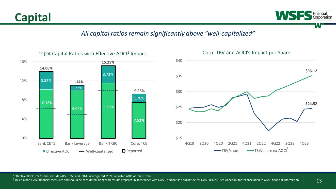 12 Investment Portfolio High-quality investment portfolio providing consistent cashflows and borrowing capacity 1 Investment portfolio value includes market value AFS and book value of HTM 2 Weighted average duration and yield of the MBS portfolio 3 This is a non-GAAP financial measure and should be considered along with results prepared in accordance with GAAP, and not as a substitute for GAAP results. See Appendix for reconciliation to GAAP financial information 4 Effective AOCI ($727.9mm) includes AFS, HTM, and HTM unrecognized MTM • Targeting 18% - 20% of total assets over time • Forecast cash flows of $1b+ over the next 24 months • Cashflows redeployed in higher yielding loans • Anticipated cashflows could fund ~3.5% annualized loan growth • AOCI grew $43mm or 7% quarter-over-quarter Investments Investment Portfolio1 $4.78b % of Total Assets 23% Portfolio Duration2 5.8yrs Portfolio Yield2 2.35% Agency MBS/Notes % >95% AOCI ($636.9mm) Effective AOCI3,4 ($727.9mm) AFS Agency MBS Agency CMOs GNMA MBS/CMOs Agency Debent. HTM Agency MBS Munis $3.73b $1.05b $618 $656 $781 $594 $637 $0 $200 $400 $600 $800 $1,000 1Q23 2Q23 3Q23 4Q23 1Q24 M ill io ns AOCI Trend