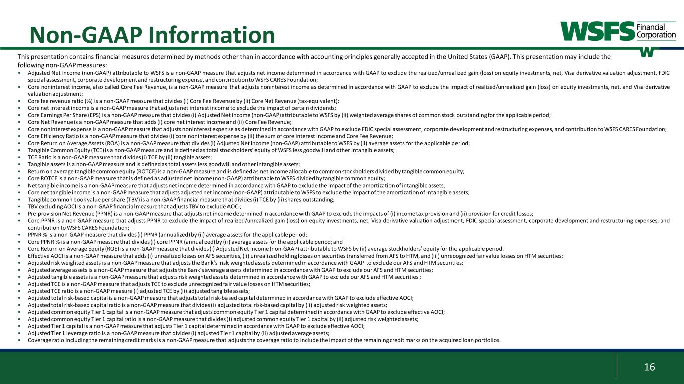 16 Non-GAAP Information This presentation contains financial measures determined by methods other than in accordance with accounting principles generally accepted in the United States (GAAP). This presentation may include the following non-GAAP measures: • Adjusted Net Income (non-GAAP) attributable to WSFS is a non-GAAP measure that adjusts net income determined in accordance with GAAP to exclude the realized/unrealized gain (loss) on equity investments, net, Visa derivative valuation adjustment, FDIC special assessment, corporate development and restructuring expense, and contribution to WSFS CARES Foundation; • Core noninterest income, also called Core Fee Revenue, is a non-GAAP measure that adjusts noninterest income as determined in accordance with GAAP to exclude the impact of realized/unrealized gain (loss) on equity investments, net, and Visa derivative valuation adjustment; • Core fee revenue ratio (%) is a non-GAAP measure that divides (i) Core Fee Revenue by (ii) Core Net Revenue (tax-equivalent); • Core net interest income is a non-GAAP measure that adjusts net interest income to exclude the impact of certain dividends; • Core Earnings Per Share (EPS) is a non-GAAP measure that divides (i) Adjusted Net Income (non-GAAP) attributable to WSFS by (ii) weighted average shares of common stock outstanding for the applicable period; • Core Net Revenue is a non-GAAP measure that adds (i) core net interest income and (ii) Core Fee Revenue; • Core noninterest expense is a non-GAAP measure that adjusts noninterest expense as determined in accordance with GAAP to exclude FDIC special assessment, corporate development and restructuring expenses, and contribution to WSFS CARES Foundation; • Core Efficiency Ratio is a non-GAAP measure that divides (i) core noninterest expense by (ii) the sum of core interest income and Core Fee Revenue; • Core Return on Average Assets (ROA) is a non-GAAP measure that divides (i) Adjusted Net Income (non-GAAP) attributable to WSFS by (ii) average assets for the applicable period; • Tangible Common Equity (TCE) is a non-GAAP measure and is defined as total stockholders’ equity of WSFS less goodwill and other intangible assets; • TCE Ratio is a non-GAAP measure that divides (i) TCE by (ii) tangible assets; • Tangible assets is a non-GAAP measure and is defined as total assets less goodwill and other intangible assets; • Return on average tangible common equity (ROTCE) is a non-GAAP measure and is defined as net income allocable to common stockholders divided by tangible common equity; • Core ROTCE is a non-GAAP measure that is defined as adjusted net income (non-GAAP) attributable to WSFS divided by tangible common equity; • Net tangible income is a non-GAAP measure that adjusts net income determined in accordance with GAAP to exclude the impact of the amortization of intangible assets; • Core net tangible income is a non-GAAP measure that adjusts adjusted net income (non-GAAP) attributable to WSFS to exclude the impact of the amortization of intangible assets; • Tangible common book value per share (TBV) is a non-GAAP financial measure that divides (i) TCE by (ii) shares outstanding; • TBV excluding AOCI is a non-GAAP financial measure that adjusts TBV to exclude AOCI; • Pre-provision Net Revenue (PPNR) is a non-GAAP measure that adjusts net income determined in accordance with GAAP to exclude the impacts of (i) income tax provision and (ii) provision for credit losses; • Core PPNR is a non-GAAP measure that adjusts PPNR to exclude the impact of realized/unrealized gain (loss) on equity investments, net, Visa derivative valuation adjustment, FDIC special assessment, corporate development and restructuring expenses, and contribution to WSFS CARES Foundation; • PPNR % is a non-GAAP measure that divides (i) PPNR (annualized) by (ii) average assets for the applicable period; • Core PPNR % is a non-GAAP measure that divides (i) core PPNR (annualized) by (ii) average assets for the applicable period; and • Core Return on Average Equity (ROE) is a non-GAAP measure that divides (i) Adjusted Net Income (non-GAAP) attributable to WSFS by (ii) average stockholders’ equity for the applicable period. • Effective AOCI is a non-GAAP measure that adds (i) unrealized losses on AFS securities, (ii) unrealized holding losses on securities transferred from AFS to HTM, and (iii) unrecognized fair value losses on HTM securities; • Adjusted risk weighted assets is a non-GAAP measure that adjusts the Bank’s risk weighted assets determined in accordance with GAAP to exclude our AFS and HTM securities; • Adjusted average assets is a non-GAAP measure that adjusts the Bank’s average assets determined in accordance with GAAP to exclude our AFS and HTM securities; • Adjusted tangible assets is a non-GAAP measure that adjusts risk weighted assets determined in accordance with GAAP to exclude our AFS and HTM securities ; • Adjusted TCE is a non-GAAP measure that adjusts TCE to exclude unrecognized fair value losses on HTM securities; • Adjusted TCE ratio is a non-GAAP measure (i) adjusted TCE by (ii) adjusted tangible assets; • Adjusted total risk-based capital is a non-GAAP measure that adjusts total risk-based capital determined in accordance with GAAP to exclude effective AOCI; • Adjusted total risk-based capital ratio is a non-GAAP measure that divides (i) adjusted total risk-based capital by (ii) adjusted risk weighted assets; • Adjusted common equity Tier 1 capital is a non-GAAP measure that adjusts common equity Tier 1 capital determined in accordance with GAAP to exclude effective AOCI; • Adjusted common equity Tier 1 capital ratio is a non-GAAP measure that divides (i) adjusted common equity Tier 1 capital by (ii) adjusted risk weighted assets; • Adjusted Tier 1 capital is a non-GAAP measure that adjusts Tier 1 capital determined in accordance with GAAP to exclude effective AOCI; • Adjusted Tier 1 leverag