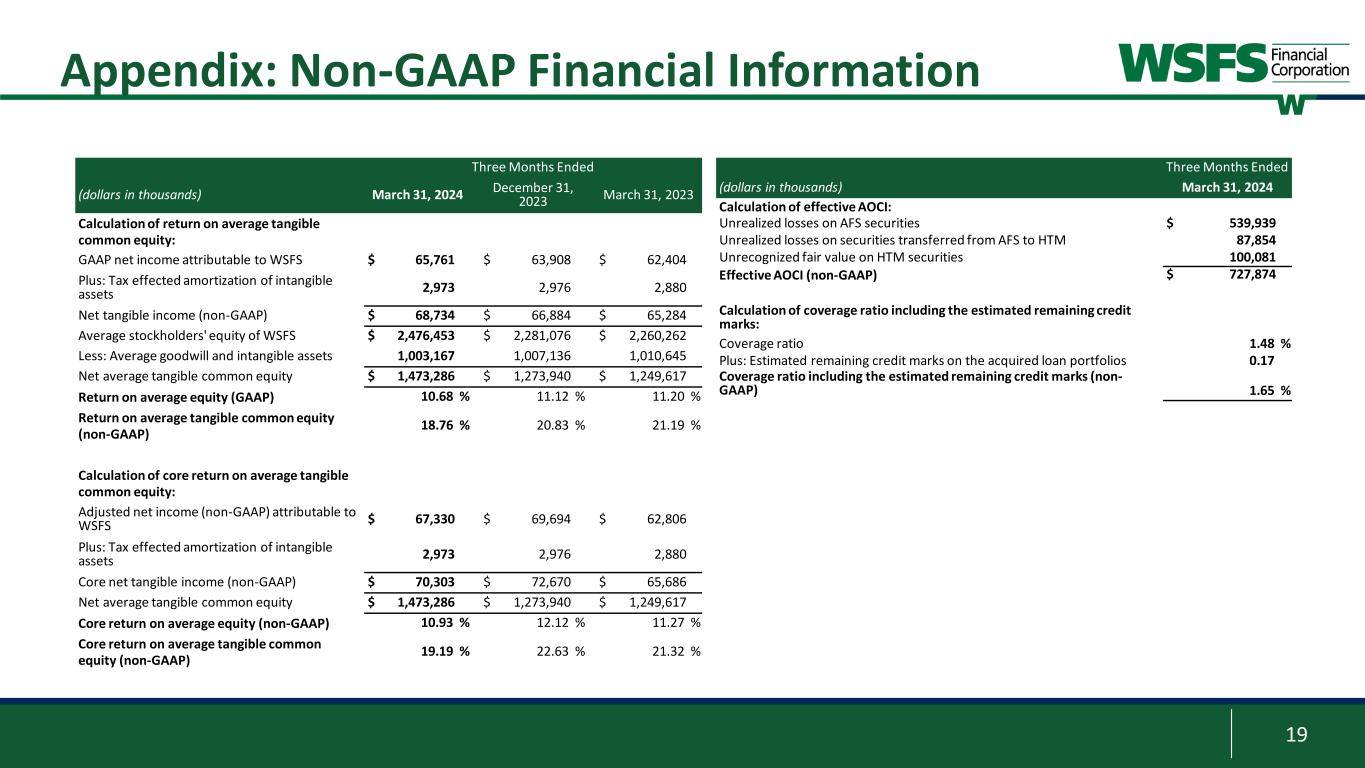 18 Appendix: Non-GAAP Financial Information 1 Pre-tax adjustments include realized/unrealized gain/(loss) on equity investments, net, Visa derivative valuation adjustment, FDIC special assessment, corporate development and restructuring expense, and contribution to WSFS Cares Foundation Three Months Ended (dollars in thousands, except per share data) March 31, 2024 December 31, 2023 March 31, 2023 GAAP net income attributable to WSFS $ 65,761 $ 63,908 $ 62,404 Plus/(less): Pre-tax adjustments1 2,076 (1,335) 536 Plus: Tax adjustments: BOLI surrender — 7,056 — (Plus)/less: Tax impact of pre-tax adjustments (507) 65 (134) Adjusted net income (non-GAAP) attributable to WSFS $ 67,330 $ 69,694 $ 62,806 Net income (GAAP) $ 65,723 $ 63,505 $ 62,662 Plus: Income tax provision 21,202 29,365 20,941 Plus: Provision for credit losses 15,138 24,816 29,011 PPNR (Non-GAAP) 102,063 117,686 112,614 Plus/(less): Pre-tax adjustments1 2,076 (1,335) 536 Core PPNR (Non-GAAP) $ 104,139 $ 116,351 $ 113,150 Average Assets $ 20,695,414 $ 20,319,204 $ 20,002,438 PPNR % (Non-GAAP) 1.98 % 2.30 % 2.28 % Core PPNR % (Non-GAAP) 2.02 % 2.27 % 2.29 % GAAP return on average assets (ROA) 1.28 % 1.25 % 1.27 % Plus/(less): Pre-tax adjustments1 0.04 (0.03) 0.01 Plus: Tax adjustments: BOLI surrender — 0.14 — (Plus)/less: Tax impact of pre-tax adjustments (0.01) — (0.01) Core ROA (non-GAAP) 1.31 % 1.36 % 1.27 % Earnings per share (diluted)(GAAP) $ 1.09 $ 1.05 $ 1.01 Plus/(less): Pre-tax adjustments1 0.03 (0.02) 0.01 Plus: Tax adjustments: BOLI surrender — 0.12 — (Plus)/less: Tax impact of pre-tax adjustments (0.01) — — Core earnings per share (non-GAAP) $ 1.11 $ 1.15 $ 1.02