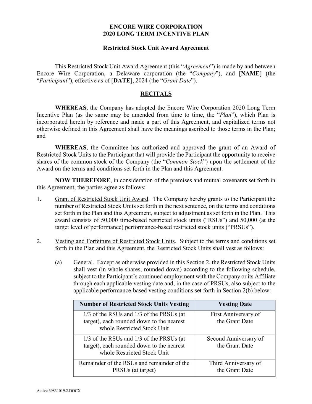 Active 69831019.2.DOCX ENCORE WIRE CORPORATION 2020 LONG TERM INCENTIVE PLAN Restricted Stock Unit Award Agreement This Restricted Stock Unit Award Agreement (this “Agreement”) is made by and between Encore Wire Corporation, a Delaware corporation (the “Company”), and [NAME] (the “Participant”), effective as of [DATE], 2024 (the “Grant Date”). RECITALS WHEREAS, the Company has adopted the Encore Wire Corporation 2020 Long Term Incentive Plan (as the same may be amended from time to time, the “Plan”), which Plan is incorporated herein by reference and made a part of this Agreement, and capitalized terms not otherwise defined in this Agreement shall have the meanings ascribed to those terms in the Plan; and WHEREAS, the Committee has authorized and approved the grant of an Award of Restricted Stock Units to the Participant that will provide the Participant the opportunity to receive shares of the common stock of the Company (the “Common Stock”) upon the settlement of the Award on the terms and conditions set forth in the Plan and this Agreement. NOW THEREFORE, in consideration of the premises and mutual covenants set forth in this Agreement, the parties agree as follows: 1. Grant of Restricted Stock Unit Award. The Company hereby grants to the Participant the number of Restricted Stock Units set forth in the next sentence, on the terms and conditions set forth in the Plan and this Agreement, subject to adjustment as set forth in the Plan. This award consists of 50,000 time-based restricted stock units (“RSUs”) and 50,000 (at the target level of performance) performance-based restricted stock units (“PRSUs”). 2. Vesting and Forfeiture of Restricted Stock Units. Subject to the terms and conditions set forth in the Plan and this Agreement, the Restricted Stock Units shall vest as follows: (a) General. Except as otherwise provided in this Section 2, the Restricted Stock Units shall vest (in whole shares, rounded down) according to the following schedule, subject to the Participant’s continued employment with the Company or its Affiliate through each applicable vesting date and, in the case of PRSUs, also subject to the applicable performance-based vesting conditions set forth in Section 2(b) below: Number of Restricted Stock Units Vesting Vesting Date 1/3 of the RSUs and 1/3 of the PRSUs (at target), each rounded down to the nearest whole Restricted Stock Unit First Anniversary of the Grant Date 1/3 of the RSUs and 1/3 of the PRSUs (at target), each rounded down to the nearest whole Restricted Stock Unit Second Anniversary of the Grant Date Remainder of the RSUs and remainder of the PRSUs (at target) Third Anniversary of the Grant Date