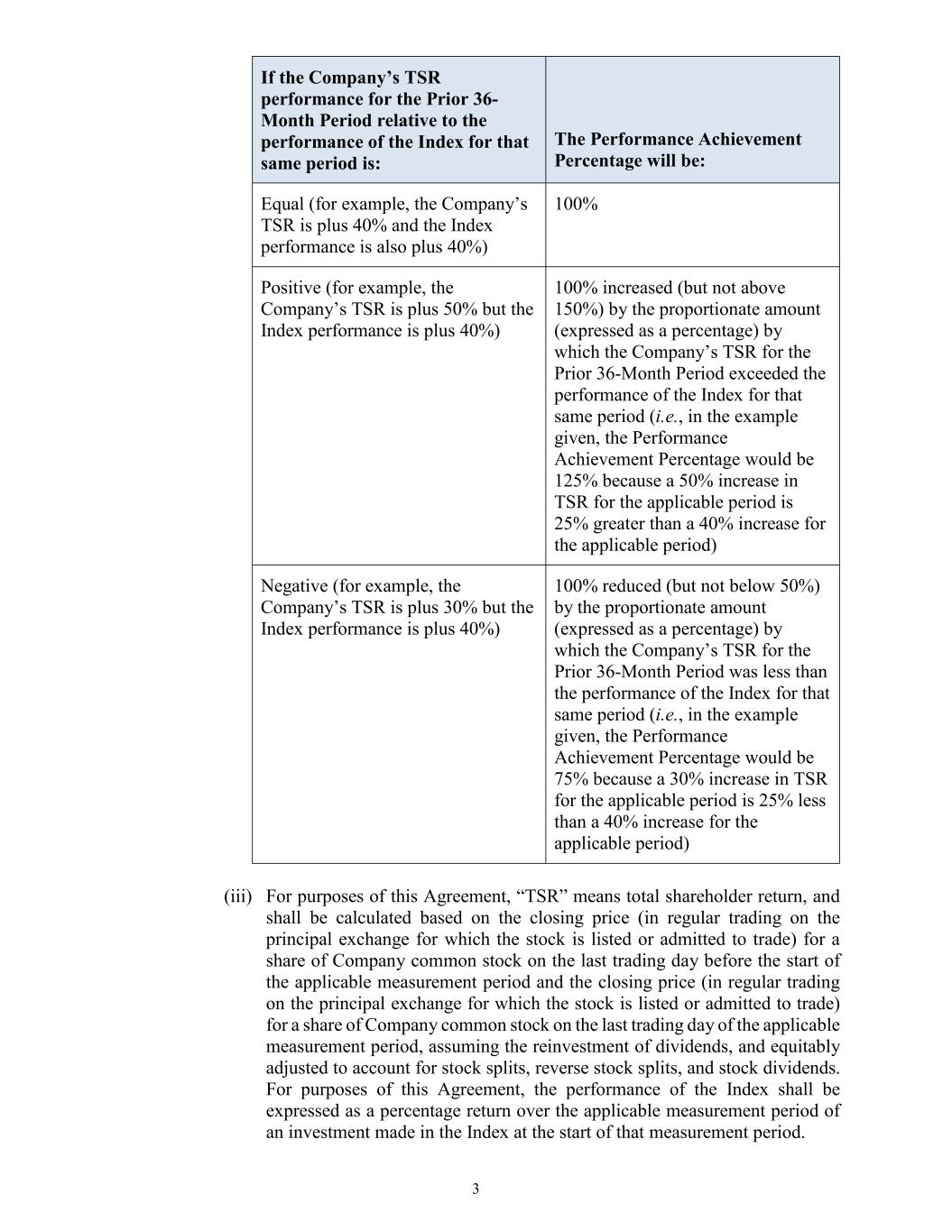 3 If the Company’s TSR performance for the Prior 36- Month Period relative to the performance of the Index for that same period is: The Performance Achievement Percentage will be: Equal (for example, the Company’s TSR is plus 40% and the Index performance is also plus 40%) 100% Positive (for example, the Company’s TSR is plus 50% but the Index performance is plus 40%) 100% increased (but not above 150%) by the proportionate amount (expressed as a percentage) by which the Company’s TSR for the Prior 36-Month Period exceeded the performance of the Index for that same period (i.e., in the example given, the Performance Achievement Percentage would be 125% because a 50% increase in TSR for the applicable period is 25% greater than a 40% increase for the applicable period) Negative (for example, the Company’s TSR is plus 30% but the Index performance is plus 40%) 100% reduced (but not below 50%) by the proportionate amount (expressed as a percentage) by which the Company’s TSR for the Prior 36-Month Period was less than the performance of the Index for that same period (i.e., in the example given, the Performance Achievement Percentage would be 75% because a 30% increase in TSR for the applicable period is 25% less than a 40% increase for the applicable period) (iii) For purposes of this Agreement, “TSR” means total shareholder return, and shall be calculated based on the closing price (in regular trading on the principal exchange for which the stock is listed or admitted to trade) for a share of Company common stock on the last trading day before the start of the applicable measurement period and the closing price (in regular trading on the principal exchange for which the stock is listed or admitted to trade) for a share of Company common stock on the last trading day of the applicable measurement period, assuming the reinvestment of dividends, and equitably adjusted to account for stock splits, reverse stock splits, and stock dividends. For purposes of this Agreement, the performance of the Index shall be expressed as a percentage return over the applicable measurement period of an investment made in the Index at the start of that measurement period.