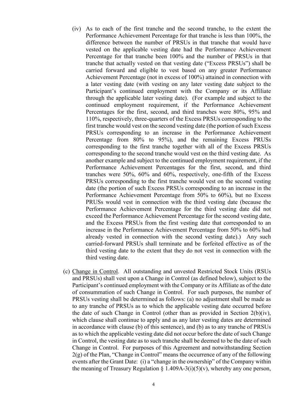 4 (iv) As to each of the first tranche and the second tranche, to the extent the Performance Achievement Percentage for that tranche is less than 100%, the difference between the number of PRSUs in that tranche that would have vested on the applicable vesting date had the Performance Achievement Percentage for that tranche been 100% and the number of PRSUs in that tranche that actually vested on that vesting date (“Excess PRSUs”) shall be carried forward and eligible to vest based on any greater Performance Achievement Percentage (not in excess of 100%) attained in connection with a later vesting date (with vesting on any later vesting date subject to the Participant’s continued employment with the Company or its Affiliate through the applicable later vesting date). (For example and subject to the continued employment requirement, if the Performance Achievement Percentages for the first, second, and third tranches were 80%, 95% and 110%, respectively, three-quarters of the Excess PRSUs corresponding to the first tranche would vest on the second vesting date (the portion of such Excess PRSUs corresponding to an increase in the Performance Achievement Percentage from 80% to 95%), and the remaining Excess PRUSs corresponding to the first tranche together with all of the Excess PRSUs corresponding to the second tranche would vest on the third vesting date. As another example and subject to the continued employment requirement, if the Performance Achievement Percentages for the first, second, and third tranches were 50%, 60% and 60%, respectively, one-fifth of the Excess PRSUs corresponding to the first tranche would vest on the second vesting date (the portion of such Excess PRSUs corresponding to an increase in the Performance Achievement Percentage from 50% to 60%), but no Excess PRUSs would vest in connection with the third vesting date (because the Performance Achievement Percentage for the third vesting date did not exceed the Performance Achievement Percentage for the second vesting date, and the Excess PRSUs from the first vesting date that corresponded to an increase in the Performance Achievement Percentage from 50% to 60% had already vested in connection with the second vesting date).) Any such carried-forward PRSUs shall terminate and be forfeited effective as of the third vesting date to the extent that they do not vest in connection with the third vesting date. (c) Change in Control. All outstanding and unvested Restricted Stock Units (RSUs and PRSUs) shall vest upon a Change in Control (as defined below), subject to the Participant’s continued employment with the Company or its Affiliate as of the date of consummation of such Change in Control. For such purposes, the number of PRSUs vesting shall be determined as follows: (a) no adjustment shall be made as to any tranche of PRSUs as to which the applicable vesting date occurred before the date of such Change in Control (other than as provided in Section 2(b)(iv), which clause shall continue to apply and as any later vesting dates are determined in accordance with clause (b) of this sentence), and (b) as to any tranche of PRSUs as to which the applicable vesting date did not occur before the date of such Change in Control, the vesting date as to such tranche shall be deemed to be the date of such Change in Control. For purposes of this Agreement and notwithstanding Section 2(g) of the Plan, “Change in Control” means the occurrence of any of the following events after the Grant Date: (i) a “change in the ownership” of the Company within the meaning of Treasury Regulation § 1.409A-3(i)(5)(v), whereby any one person,
