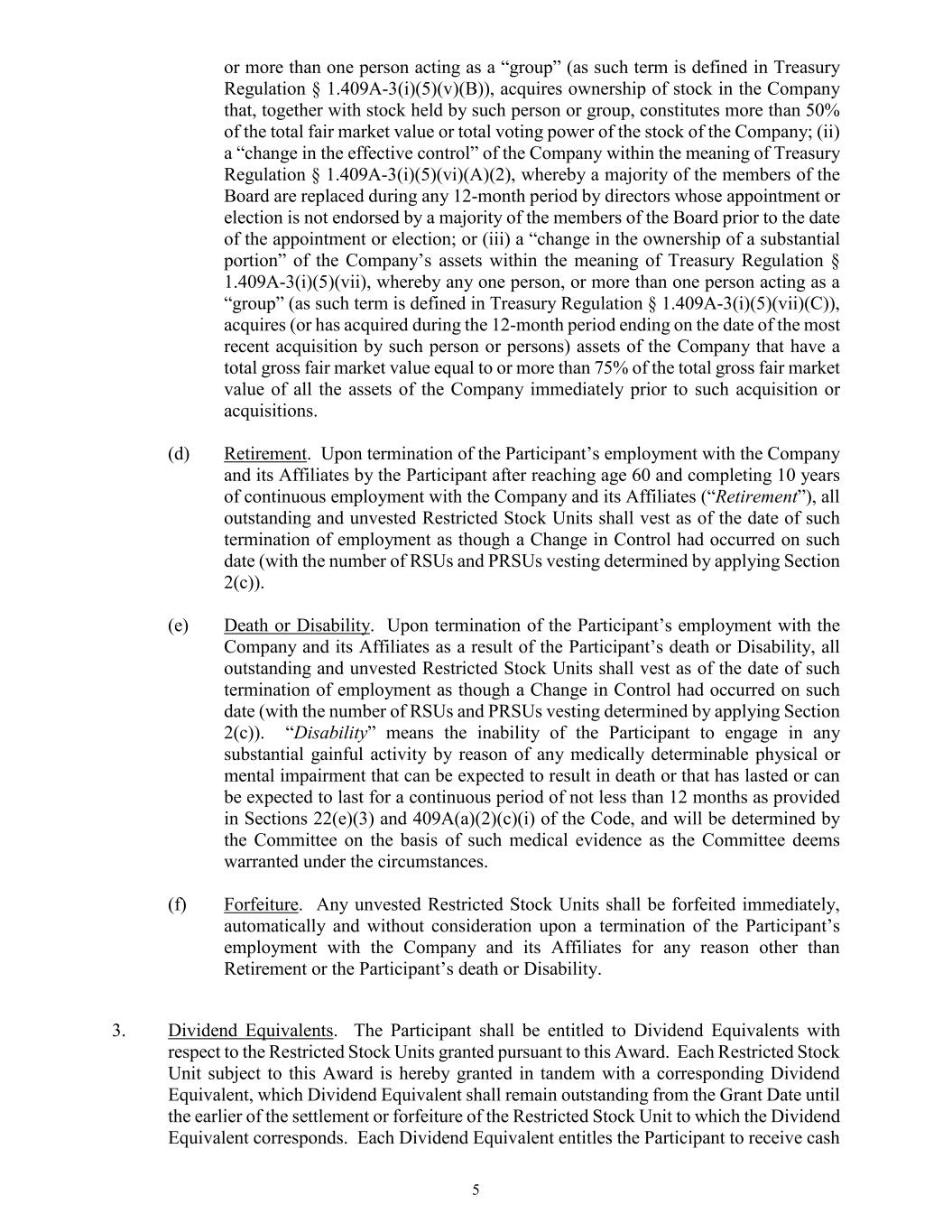 5 or more than one person acting as a “group” (as such term is defined in Treasury Regulation § 1.409A-3(i)(5)(v)(B)), acquires ownership of stock in the Company that, together with stock held by such person or group, constitutes more than 50% of the total fair market value or total voting power of the stock of the Company; (ii) a “change in the effective control” of the Company within the meaning of Treasury Regulation § 1.409A-3(i)(5)(vi)(A)(2), whereby a majority of the members of the Board are replaced during any 12-month period by directors whose appointment or election is not endorsed by a majority of the members of the Board prior to the date of the appointment or election; or (iii) a “change in the ownership of a substantial portion” of the Company’s assets within the meaning of Treasury Regulation § 1.409A-3(i)(5)(vii), whereby any one person, or more than one person acting as a “group” (as such term is defined in Treasury Regulation § 1.409A-3(i)(5)(vii)(C)), acquires (or has acquired during the 12-month period ending on the date of the most recent acquisition by such person or persons) assets of the Company that have a total gross fair market value equal to or more than 75% of the total gross fair market value of all the assets of the Company immediately prior to such acquisition or acquisitions. (d) Retirement. Upon termination of the Participant’s employment with the Company and its Affiliates by the Participant after reaching age 60 and completing 10 years of continuous employment with the Company and its Affiliates (“Retirement”), all outstanding and unvested Restricted Stock Units shall vest as of the date of such termination of employment as though a Change in Control had occurred on such date (with the number of RSUs and PRSUs vesting determined by applying Section 2(c)). (e) Death or Disability. Upon termination of the Participant’s employment with the Company and its Affiliates as a result of the Participant’s death or Disability, all outstanding and unvested Restricted Stock Units shall vest as of the date of such termination of employment as though a Change in Control had occurred on such date (with the number of RSUs and PRSUs vesting determined by applying Section 2(c)). “Disability” means the inability of the Participant to engage in any substantial gainful activity by reason of any medically determinable physical or mental impairment that can be expected to result in death or that has lasted or can be expected to last for a continuous period of not less than 12 months as provided in Sections 22(e)(3) and 409A(a)(2)(c)(i) of the Code, and will be determined by the Committee on the basis of such medical evidence as the Committee deems warranted under the circumstances. (f) Forfeiture. Any unvested Restricted Stock Units shall be forfeited immediately, automatically and without consideration upon a termination of the Participant’s employment with the Company and its Affiliates for any reason other than Retirement or the Participant’s death or Disability. 3. Dividend Equivalents. The Participant shall be entitled to Dividend Equivalents with respect to the Restricted Stock Units granted pursuant to this Award. Each Restricted Stock Unit subject to this Award is hereby granted in tandem with a corresponding Dividend Equivalent, which Dividend Equivalent shall remain outstanding from the Grant Date until the earlier of the settlement or forfeiture of the Restricted Stock Unit to which the Dividend Equivalent corresponds. Each Dividend Equivalent entitles the Participant to receive cash