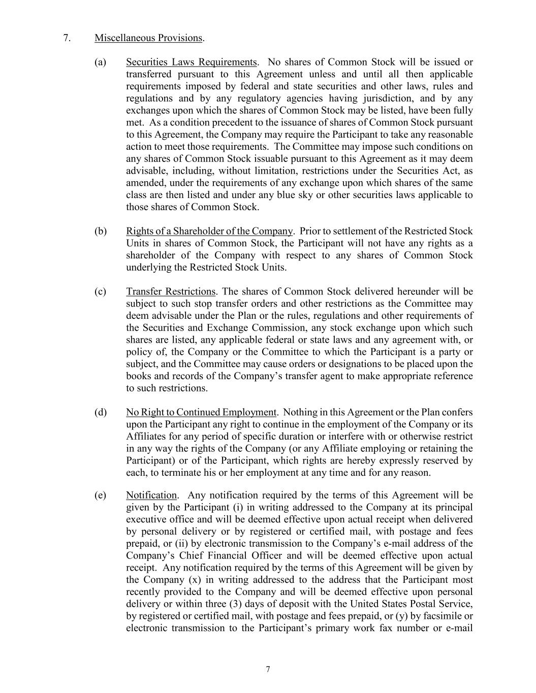 7 7. Miscellaneous Provisions. (a) Securities Laws Requirements. No shares of Common Stock will be issued or transferred pursuant to this Agreement unless and until all then applicable requirements imposed by federal and state securities and other laws, rules and regulations and by any regulatory agencies having jurisdiction, and by any exchanges upon which the shares of Common Stock may be listed, have been fully met. As a condition precedent to the issuance of shares of Common Stock pursuant to this Agreement, the Company may require the Participant to take any reasonable action to meet those requirements. The Committee may impose such conditions on any shares of Common Stock issuable pursuant to this Agreement as it may deem advisable, including, without limitation, restrictions under the Securities Act, as amended, under the requirements of any exchange upon which shares of the same class are then listed and under any blue sky or other securities laws applicable to those shares of Common Stock. (b) Rights of a Shareholder of the Company. Prior to settlement of the Restricted Stock Units in shares of Common Stock, the Participant will not have any rights as a shareholder of the Company with respect to any shares of Common Stock underlying the Restricted Stock Units. (c) Transfer Restrictions. The shares of Common Stock delivered hereunder will be subject to such stop transfer orders and other restrictions as the Committee may deem advisable under the Plan or the rules, regulations and other requirements of the Securities and Exchange Commission, any stock exchange upon which such shares are listed, any applicable federal or state laws and any agreement with, or policy of, the Company or the Committee to which the Participant is a party or subject, and the Committee may cause orders or designations to be placed upon the books and records of the Company’s transfer agent to make appropriate reference to such restrictions. (d) No Right to Continued Employment. Nothing in this Agreement or the Plan confers upon the Participant any right to continue in the employment of the Company or its Affiliates for any period of specific duration or interfere with or otherwise restrict in any way the rights of the Company (or any Affiliate employing or retaining the Participant) or of the Participant, which rights are hereby expressly reserved by each, to terminate his or her employment at any time and for any reason. (e) Notification. Any notification required by the terms of this Agreement will be given by the Participant (i) in writing addressed to the Company at its principal executive office and will be deemed effective upon actual receipt when delivered by personal delivery or by registered or certified mail, with postage and fees prepaid, or (ii) by electronic transmission to the Company’s e-mail address of the Company’s Chief Financial Officer and will be deemed effective upon actual receipt. Any notification required by the terms of this Agreement will be given by the Company (x) in writing addressed to the address that the Participant most recently provided to the Company and will be deemed effective upon personal delivery or within three (3) days of deposit with the United States Postal Service, by registered or certified mail, with postage and fees prepaid, or (y) by facsimile or electronic transmission to the Participant’s primary work fax number or e-mail