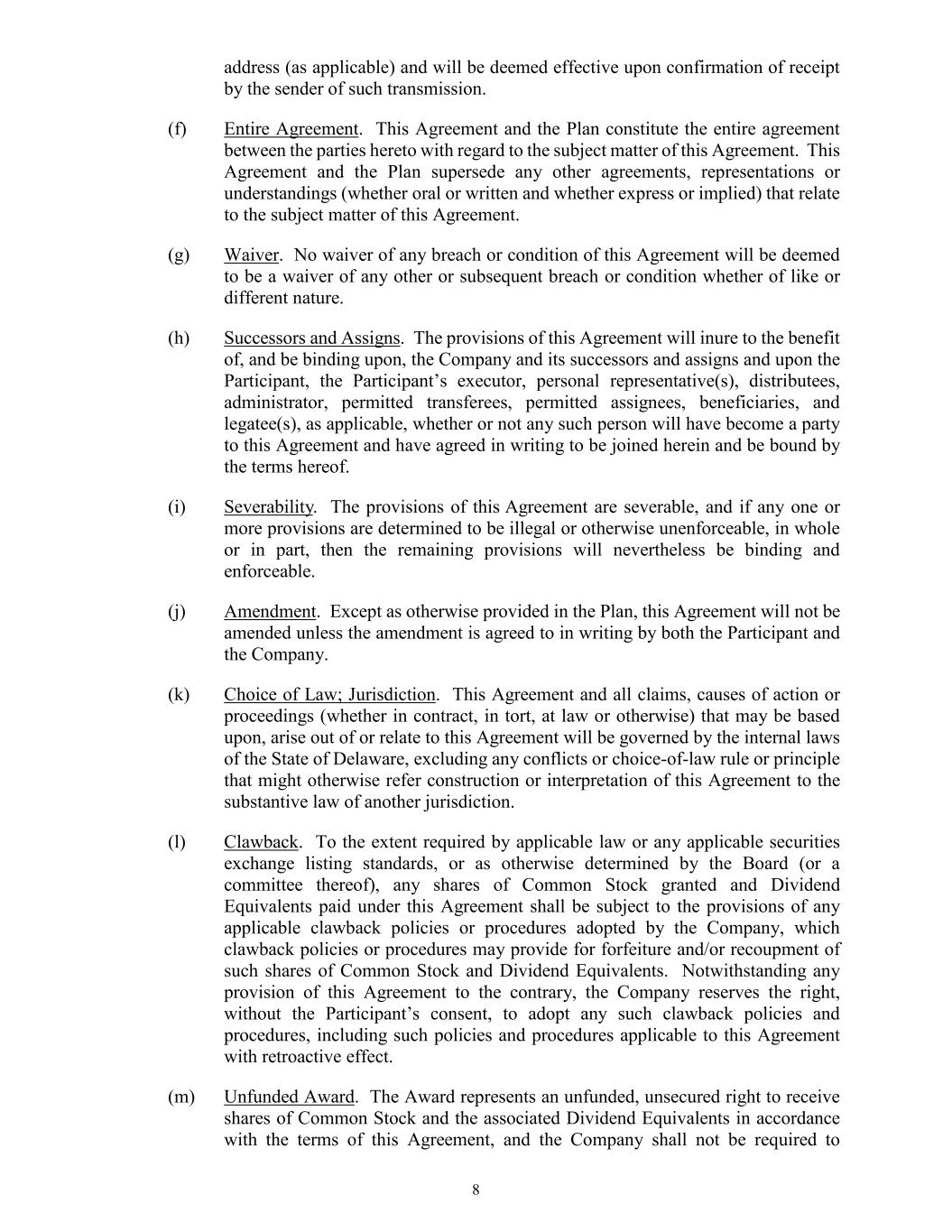 8 address (as applicable) and will be deemed effective upon confirmation of receipt by the sender of such transmission. (f) Entire Agreement. This Agreement and the Plan constitute the entire agreement between the parties hereto with regard to the subject matter of this Agreement. This Agreement and the Plan supersede any other agreements, representations or understandings (whether oral or written and whether express or implied) that relate to the subject matter of this Agreement. (g) Waiver. No waiver of any breach or condition of this Agreement will be deemed to be a waiver of any other or subsequent breach or condition whether of like or different nature. (h) Successors and Assigns. The provisions of this Agreement will inure to the benefit of, and be binding upon, the Company and its successors and assigns and upon the Participant, the Participant’s executor, personal representative(s), distributees, administrator, permitted transferees, permitted assignees, beneficiaries, and legatee(s), as applicable, whether or not any such person will have become a party to this Agreement and have agreed in writing to be joined herein and be bound by the terms hereof. (i) Severability. The provisions of this Agreement are severable, and if any one or more provisions are determined to be illegal or otherwise unenforceable, in whole or in part, then the remaining provisions will nevertheless be binding and enforceable. (j) Amendment. Except as otherwise provided in the Plan, this Agreement will not be amended unless the amendment is agreed to in writing by both the Participant and the Company. (k) Choice of Law; Jurisdiction. This Agreement and all claims, causes of action or proceedings (whether in contract, in tort, at law or otherwise) that may be based upon, arise out of or relate to this Agreement will be governed by the internal laws of the State of Delaware, excluding any conflicts or choice-of-law rule or principle that might otherwise refer construction or interpretation of this Agreement to the substantive law of another jurisdiction. (l) Clawback. To the extent required by applicable law or any applicable securities exchange listing standards, or as otherwise determined by the Board (or a committee thereof), any shares of Common Stock granted and Dividend Equivalents paid under this Agreement shall be subject to the provisions of any applicable clawback policies or procedures adopted by the Company, which clawback policies or procedures may provide for forfeiture and/or recoupment of such shares of Common Stock and Dividend Equivalents. Notwithstanding any provision of this Agreement to the contrary, the Company reserves the right, without the Participant’s consent, to adopt any such clawback policies and procedures, including such policies and procedures applicable to this Agreement with retroactive effect. (m) Unfunded Award. The Award represents an unfunded, unsecured right to receive shares of Common Stock and the associated Dividend Equivalents in accordance with the terms of this Agreement, and the Company shall not be required to
