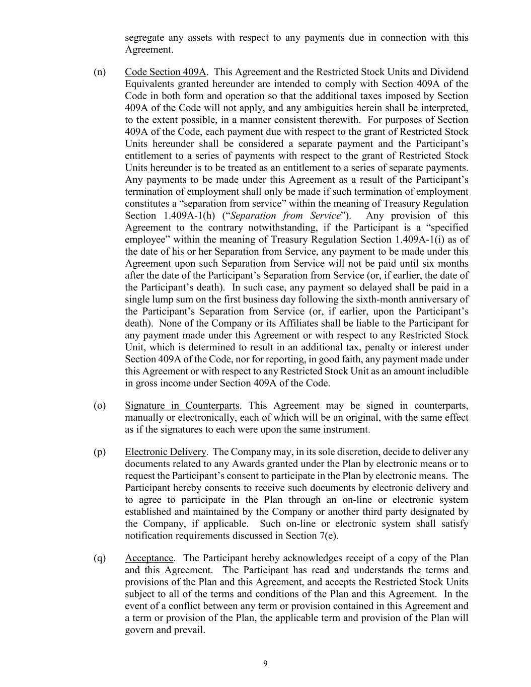 9 segregate any assets with respect to any payments due in connection with this Agreement. (n) Code Section 409A. This Agreement and the Restricted Stock Units and Dividend Equivalents granted hereunder are intended to comply with Section 409A of the Code in both form and operation so that the additional taxes imposed by Section 409A of the Code will not apply, and any ambiguities herein shall be interpreted, to the extent possible, in a manner consistent therewith. For purposes of Section 409A of the Code, each payment due with respect to the grant of Restricted Stock Units hereunder shall be considered a separate payment and the Participant’s entitlement to a series of payments with respect to the grant of Restricted Stock Units hereunder is to be treated as an entitlement to a series of separate payments. Any payments to be made under this Agreement as a result of the Participant’s termination of employment shall only be made if such termination of employment constitutes a “separation from service” within the meaning of Treasury Regulation Section 1.409A-1(h) (“Separation from Service”). Any provision of this Agreement to the contrary notwithstanding, if the Participant is a “specified employee” within the meaning of Treasury Regulation Section 1.409A-1(i) as of the date of his or her Separation from Service, any payment to be made under this Agreement upon such Separation from Service will not be paid until six months after the date of the Participant’s Separation from Service (or, if earlier, the date of the Participant’s death). In such case, any payment so delayed shall be paid in a single lump sum on the first business day following the sixth-month anniversary of the Participant’s Separation from Service (or, if earlier, upon the Participant’s death). None of the Company or its Affiliates shall be liable to the Participant for any payment made under this Agreement or with respect to any Restricted Stock Unit, which is determined to result in an additional tax, penalty or interest under Section 409A of the Code, nor for reporting, in good faith, any payment made under this Agreement or with respect to any Restricted Stock Unit as an amount includible in gross income under Section 409A of the Code. (o) Signature in Counterparts. This Agreement may be signed in counterparts, manually or electronically, each of which will be an original, with the same effect as if the signatures to each were upon the same instrument. (p) Electronic Delivery. The Company may, in its sole discretion, decide to deliver any documents related to any Awards granted under the Plan by electronic means or to request the Participant’s consent to participate in the Plan by electronic means. The Participant hereby consents to receive such documents by electronic delivery and to agree to participate in the Plan through an on-line or electronic system established and maintained by the Company or another third party designated by the Company, if applicable. Such on-line or electronic system shall satisfy notification requirements discussed in Section 7(e). (q) Acceptance. The Participant hereby acknowledges receipt of a copy of the Plan and this Agreement. The Participant has read and understands the terms and provisions of the Plan and this Agreement, and accepts the Restricted Stock Units subject to all of the terms and conditions of the Plan and this Agreement. In the event of a conflict between any term or provision contained in this Agreement and a term or provision of the Plan, the applicable term and provision of the Plan will govern and prevail.