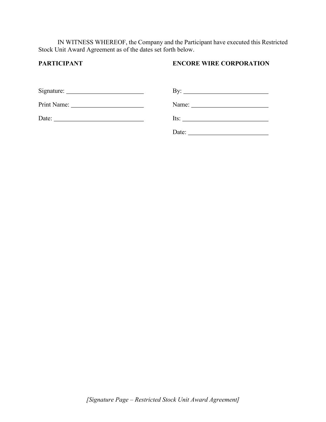 [Signature Page – Restricted Stock Unit Award Agreement] IN WITNESS WHEREOF, the Company and the Participant have executed this Restricted Stock Unit Award Agreement as of the dates set forth below. PARTICIPANT ENCORE WIRE CORPORATION Signature: By: Print Name: Name: Date: Its: Date: