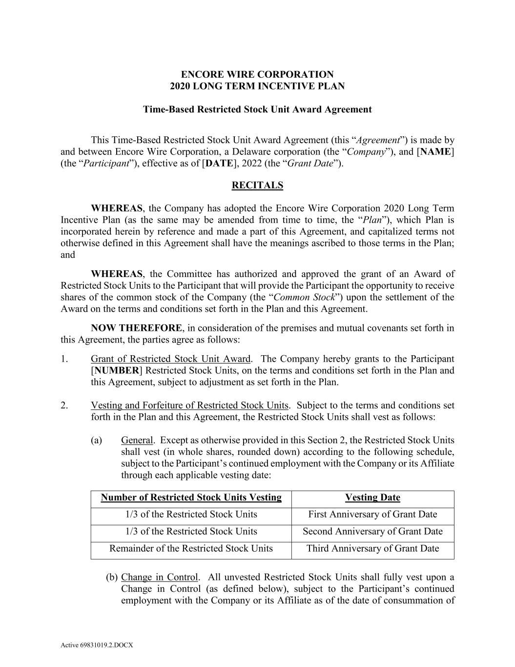 Active 69831019.2.DOCX ENCORE WIRE CORPORATION 2020 LONG TERM INCENTIVE PLAN Time-Based Restricted Stock Unit Award Agreement This Time-Based Restricted Stock Unit Award Agreement (this “Agreement”) is made by and between Encore Wire Corporation, a Delaware corporation (the “Company”), and [NAME] (the “Participant”), effective as of [DATE], 2022 (the “Grant Date”). RECITALS WHEREAS, the Company has adopted the Encore Wire Corporation 2020 Long Term Incentive Plan (as the same may be amended from time to time, the “Plan”), which Plan is incorporated herein by reference and made a part of this Agreement, and capitalized terms not otherwise defined in this Agreement shall have the meanings ascribed to those terms in the Plan; and WHEREAS, the Committee has authorized and approved the grant of an Award of Restricted Stock Units to the Participant that will provide the Participant the opportunity to receive shares of the common stock of the Company (the “Common Stock”) upon the settlement of the Award on the terms and conditions set forth in the Plan and this Agreement. NOW THEREFORE, in consideration of the premises and mutual covenants set forth in this Agreement, the parties agree as follows: 1. Grant of Restricted Stock Unit Award. The Company hereby grants to the Participant [NUMBER] Restricted Stock Units, on the terms and conditions set forth in the Plan and this Agreement, subject to adjustment as set forth in the Plan. 2. Vesting and Forfeiture of Restricted Stock Units. Subject to the terms and conditions set forth in the Plan and this Agreement, the Restricted Stock Units shall vest as follows: (a) General. Except as otherwise provided in this Section 2, the Restricted Stock Units shall vest (in whole shares, rounded down) according to the following schedule, subject to the Participant’s continued employment with the Company or its Affiliate through each applicable vesting date: Number of Restricted Stock Units Vesting Vesting Date 1/3 of the Restricted Stock Units First Anniversary of Grant Date 1/3 of the Restricted Stock Units Second Anniversary of Grant Date Remainder of the Restricted Stock Units Third Anniversary of Grant Date (b) Change in Control. All unvested Restricted Stock Units shall fully vest upon a Change in Control (as defined below), subject to the Participant’s continued employment with the Company or its Affiliate as of the date of consummation of