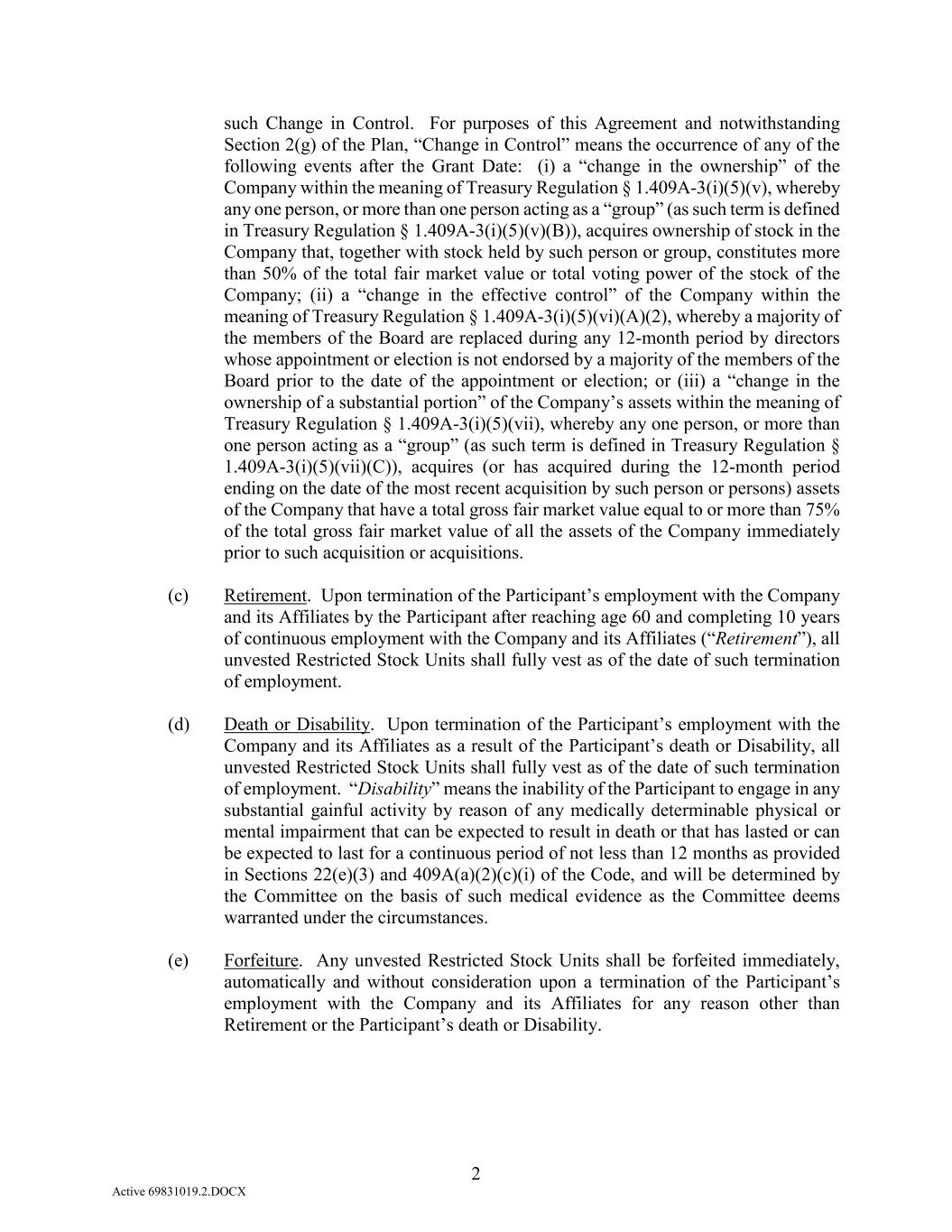 2 Active 69831019.2.DOCX such Change in Control. For purposes of this Agreement and notwithstanding Section 2(g) of the Plan, “Change in Control” means the occurrence of any of the following events after the Grant Date: (i) a “change in the ownership” of the Company within the meaning of Treasury Regulation § 1.409A-3(i)(5)(v), whereby any one person, or more than one person acting as a “group” (as such term is defined in Treasury Regulation § 1.409A-3(i)(5)(v)(B)), acquires ownership of stock in the Company that, together with stock held by such person or group, constitutes more than 50% of the total fair market value or total voting power of the stock of the Company; (ii) a “change in the effective control” of the Company within the meaning of Treasury Regulation § 1.409A-3(i)(5)(vi)(A)(2), whereby a majority of the members of the Board are replaced during any 12-month period by directors whose appointment or election is not endorsed by a majority of the members of the Board prior to the date of the appointment or election; or (iii) a “change in the ownership of a substantial portion” of the Company’s assets within the meaning of Treasury Regulation § 1.409A-3(i)(5)(vii), whereby any one person, or more than one person acting as a “group” (as such term is defined in Treasury Regulation § 1.409A-3(i)(5)(vii)(C)), acquires (or has acquired during the 12-month period ending on the date of the most recent acquisition by such person or persons) assets of the Company that have a total gross fair market value equal to or more than 75% of the total gross fair market value of all the assets of the Company immediately prior to such acquisition or acquisitions. (c) Retirement. Upon termination of the Participant’s employment with the Company and its Affiliates by the Participant after reaching age 60 and completing 10 years of continuous employment with the Company and its Affiliates (“Retirement”), all unvested Restricted Stock Units shall fully vest as of the date of such termination of employment. (d) Death or Disability. Upon termination of the Participant’s employment with the Company and its Affiliates as a result of the Participant’s death or Disability, all unvested Restricted Stock Units shall fully vest as of the date of such termination of employment. “Disability” means the inability of the Participant to engage in any substantial gainful activity by reason of any medically determinable physical or mental impairment that can be expected to result in death or that has lasted or can be expected to last for a continuous period of not less than 12 months as provided in Sections 22(e)(3) and 409A(a)(2)(c)(i) of the Code, and will be determined by the Committee on the basis of such medical evidence as the Committee deems warranted under the circumstances. (e) Forfeiture. Any unvested Restricted Stock Units shall be forfeited immediately, automatically and without consideration upon a termination of the Participant’s employment with the Company and its Affiliates for any reason other than Retirement or the Participant’s death or Disability.