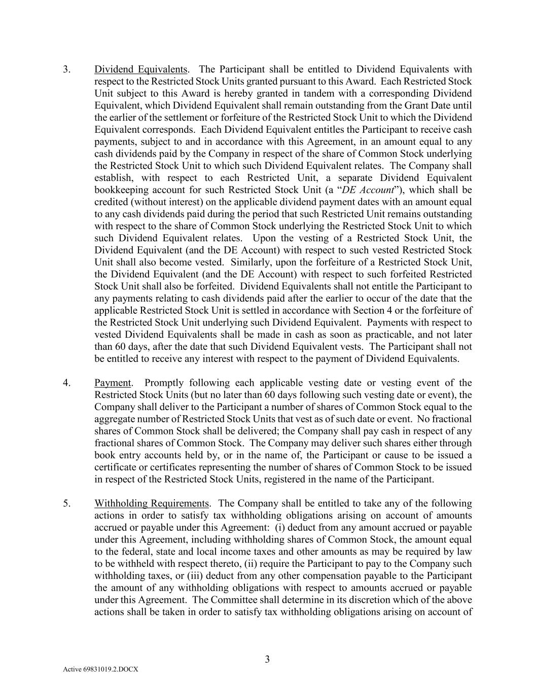 3 Active 69831019.2.DOCX 3. Dividend Equivalents. The Participant shall be entitled to Dividend Equivalents with respect to the Restricted Stock Units granted pursuant to this Award. Each Restricted Stock Unit subject to this Award is hereby granted in tandem with a corresponding Dividend Equivalent, which Dividend Equivalent shall remain outstanding from the Grant Date until the earlier of the settlement or forfeiture of the Restricted Stock Unit to which the Dividend Equivalent corresponds. Each Dividend Equivalent entitles the Participant to receive cash payments, subject to and in accordance with this Agreement, in an amount equal to any cash dividends paid by the Company in respect of the share of Common Stock underlying the Restricted Stock Unit to which such Dividend Equivalent relates. The Company shall establish, with respect to each Restricted Unit, a separate Dividend Equivalent bookkeeping account for such Restricted Stock Unit (a “DE Account”), which shall be credited (without interest) on the applicable dividend payment dates with an amount equal to any cash dividends paid during the period that such Restricted Unit remains outstanding with respect to the share of Common Stock underlying the Restricted Stock Unit to which such Dividend Equivalent relates. Upon the vesting of a Restricted Stock Unit, the Dividend Equivalent (and the DE Account) with respect to such vested Restricted Stock Unit shall also become vested. Similarly, upon the forfeiture of a Restricted Stock Unit, the Dividend Equivalent (and the DE Account) with respect to such forfeited Restricted Stock Unit shall also be forfeited. Dividend Equivalents shall not entitle the Participant to any payments relating to cash dividends paid after the earlier to occur of the date that the applicable Restricted Stock Unit is settled in accordance with Section 4 or the forfeiture of the Restricted Stock Unit underlying such Dividend Equivalent. Payments with respect to vested Dividend Equivalents shall be made in cash as soon as practicable, and not later than 60 days, after the date that such Dividend Equivalent vests. The Participant shall not be entitled to receive any interest with respect to the payment of Dividend Equivalents. 4. Payment. Promptly following each applicable vesting date or vesting event of the Restricted Stock Units (but no later than 60 days following such vesting date or event), the Company shall deliver to the Participant a number of shares of Common Stock equal to the aggregate number of Restricted Stock Units that vest as of such date or event. No fractional shares of Common Stock shall be delivered; the Company shall pay cash in respect of any fractional shares of Common Stock. The Company may deliver such shares either through book entry accounts held by, or in the name of, the Participant or cause to be issued a certificate or certificates representing the number of shares of Common Stock to be issued in respect of the Restricted Stock Units, registered in the name of the Participant. 5. Withholding Requirements. The Company shall be entitled to take any of the following actions in order to satisfy tax withholding obligations arising on account of amounts accrued or payable under this Agreement: (i) deduct from any amount accrued or payable under this Agreement, including withholding shares of Common Stock, the amount equal to the federal, state and local income taxes and other amounts as may be required by law to be withheld with respect thereto, (ii) require the Participant to pay to the Company such withholding taxes, or (iii) deduct from any other compensation payable to the Participant the amount of any withholding obligations with respect to amounts accrued or payable under this Agreement. The Committee shall determine in its discretion which of the above actions shall be taken in order to satisfy tax withholding obligations arising on account of