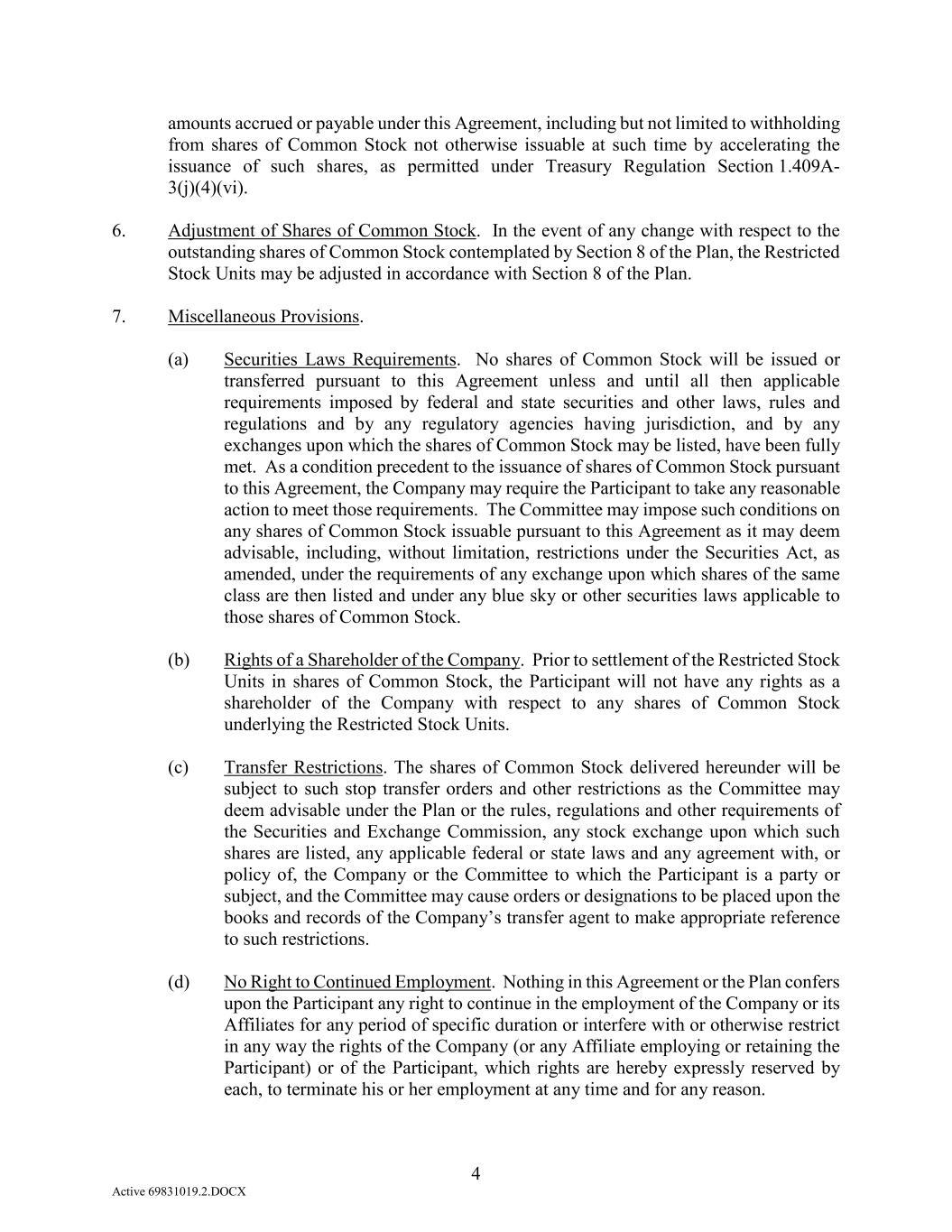 4 Active 69831019.2.DOCX amounts accrued or payable under this Agreement, including but not limited to withholding from shares of Common Stock not otherwise issuable at such time by accelerating the issuance of such shares, as permitted under Treasury Regulation Section 1.409A- 3(j)(4)(vi). 6. Adjustment of Shares of Common Stock. In the event of any change with respect to the outstanding shares of Common Stock contemplated by Section 8 of the Plan, the Restricted Stock Units may be adjusted in accordance with Section 8 of the Plan. 7. Miscellaneous Provisions. (a) Securities Laws Requirements. No shares of Common Stock will be issued or transferred pursuant to this Agreement unless and until all then applicable requirements imposed by federal and state securities and other laws, rules and regulations and by any regulatory agencies having jurisdiction, and by any exchanges upon which the shares of Common Stock may be listed, have been fully met. As a condition precedent to the issuance of shares of Common Stock pursuant to this Agreement, the Company may require the Participant to take any reasonable action to meet those requirements. The Committee may impose such conditions on any shares of Common Stock issuable pursuant to this Agreement as it may deem advisable, including, without limitation, restrictions under the Securities Act, as amended, under the requirements of any exchange upon which shares of the same class are then listed and under any blue sky or other securities laws applicable to those shares of Common Stock. (b) Rights of a Shareholder of the Company. Prior to settlement of the Restricted Stock Units in shares of Common Stock, the Participant will not have any rights as a shareholder of the Company with respect to any shares of Common Stock underlying the Restricted Stock Units. (c) Transfer Restrictions. The shares of Common Stock delivered hereunder will be subject to such stop transfer orders and other restrictions as the Committee may deem advisable under the Plan or the rules, regulations and other requirements of the Securities and Exchange Commission, any stock exchange upon which such shares are listed, any applicable federal or state laws and any agreement with, or policy of, the Company or the Committee to which the Participant is a party or subject, and the Committee may cause orders or designations to be placed upon the books and records of the Company’s transfer agent to make appropriate reference to such restrictions. (d) No Right to Continued Employment. Nothing in this Agreement or the Plan confers upon the Participant any right to continue in the employment of the Company or its Affiliates for any period of specific duration or interfere with or otherwise restrict in any way the rights of the Company (or any Affiliate employing or retaining the Participant) or of the Participant, which rights are hereby expressly reserved by each, to terminate his or her employment at any time and for any reason.