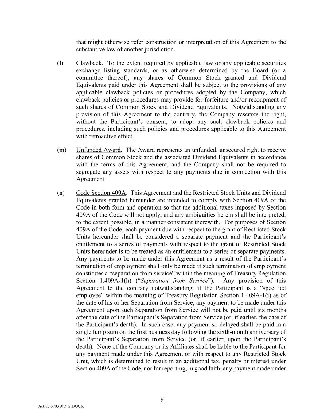 6 Active 69831019.2.DOCX that might otherwise refer construction or interpretation of this Agreement to the substantive law of another jurisdiction. (l) Clawback. To the extent required by applicable law or any applicable securities exchange listing standards, or as otherwise determined by the Board (or a committee thereof), any shares of Common Stock granted and Dividend Equivalents paid under this Agreement shall be subject to the provisions of any applicable clawback policies or procedures adopted by the Company, which clawback policies or procedures may provide for forfeiture and/or recoupment of such shares of Common Stock and Dividend Equivalents. Notwithstanding any provision of this Agreement to the contrary, the Company reserves the right, without the Participant’s consent, to adopt any such clawback policies and procedures, including such policies and procedures applicable to this Agreement with retroactive effect. (m) Unfunded Award. The Award represents an unfunded, unsecured right to receive shares of Common Stock and the associated Dividend Equivalents in accordance with the terms of this Agreement, and the Company shall not be required to segregate any assets with respect to any payments due in connection with this Agreement. (n) Code Section 409A. This Agreement and the Restricted Stock Units and Dividend Equivalents granted hereunder are intended to comply with Section 409A of the Code in both form and operation so that the additional taxes imposed by Section 409A of the Code will not apply, and any ambiguities herein shall be interpreted, to the extent possible, in a manner consistent therewith. For purposes of Section 409A of the Code, each payment due with respect to the grant of Restricted Stock Units hereunder shall be considered a separate payment and the Participant’s entitlement to a series of payments with respect to the grant of Restricted Stock Units hereunder is to be treated as an entitlement to a series of separate payments. Any payments to be made under this Agreement as a result of the Participant’s termination of employment shall only be made if such termination of employment constitutes a “separation from service” within the meaning of Treasury Regulation Section 1.409A-1(h) (“Separation from Service”). Any provision of this Agreement to the contrary notwithstanding, if the Participant is a “specified employee” within the meaning of Treasury Regulation Section 1.409A-1(i) as of the date of his or her Separation from Service, any payment to be made under this Agreement upon such Separation from Service will not be paid until six months after the date of the Participant’s Separation from Service (or, if earlier, the date of the Participant’s death). In such case, any payment so delayed shall be paid in a single lump sum on the first business day following the sixth-month anniversary of the Participant’s Separation from Service (or, if earlier, upon the Participant’s death). None of the Company or its Affiliates shall be liable to the Participant for any payment made under this Agreement or with respect to any Restricted Stock Unit, which is determined to result in an additional tax, penalty or interest under Section 409A of the Code, nor for reporting, in good faith, any payment made under