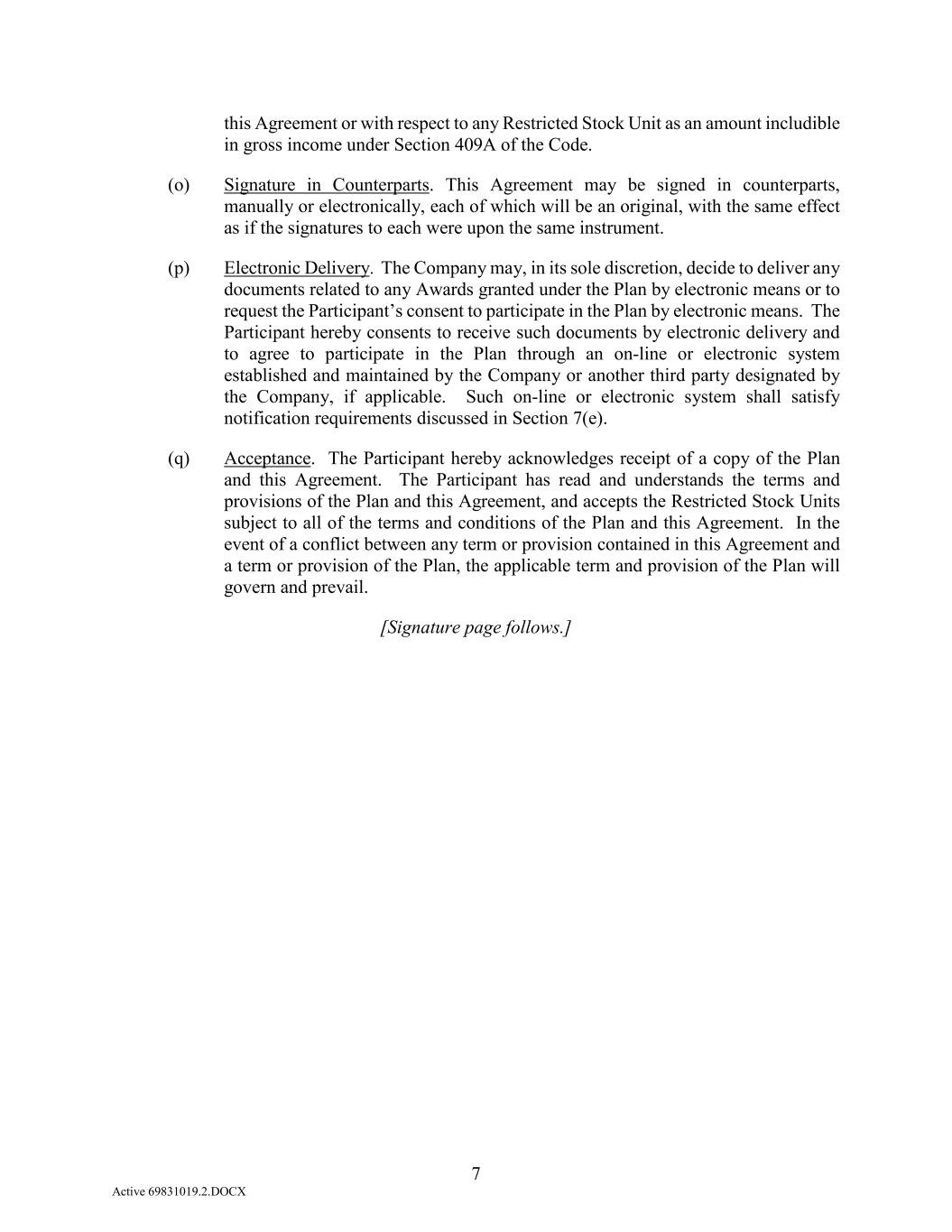 7 Active 69831019.2.DOCX this Agreement or with respect to any Restricted Stock Unit as an amount includible in gross income under Section 409A of the Code. (o) Signature in Counterparts. This Agreement may be signed in counterparts, manually or electronically, each of which will be an original, with the same effect as if the signatures to each were upon the same instrument. (p) Electronic Delivery. The Company may, in its sole discretion, decide to deliver any documents related to any Awards granted under the Plan by electronic means or to request the Participant’s consent to participate in the Plan by electronic means. The Participant hereby consents to receive such documents by electronic delivery and to agree to participate in the Plan through an on-line or electronic system established and maintained by the Company or another third party designated by the Company, if applicable. Such on-line or electronic system shall satisfy notification requirements discussed in Section 7(e). (q) Acceptance. The Participant hereby acknowledges receipt of a copy of the Plan and this Agreement. The Participant has read and understands the terms and provisions of the Plan and this Agreement, and accepts the Restricted Stock Units subject to all of the terms and conditions of the Plan and this Agreement. In the event of a conflict between any term or provision contained in this Agreement and a term or provision of the Plan, the applicable term and provision of the Plan will govern and prevail. [Signature page follows.]